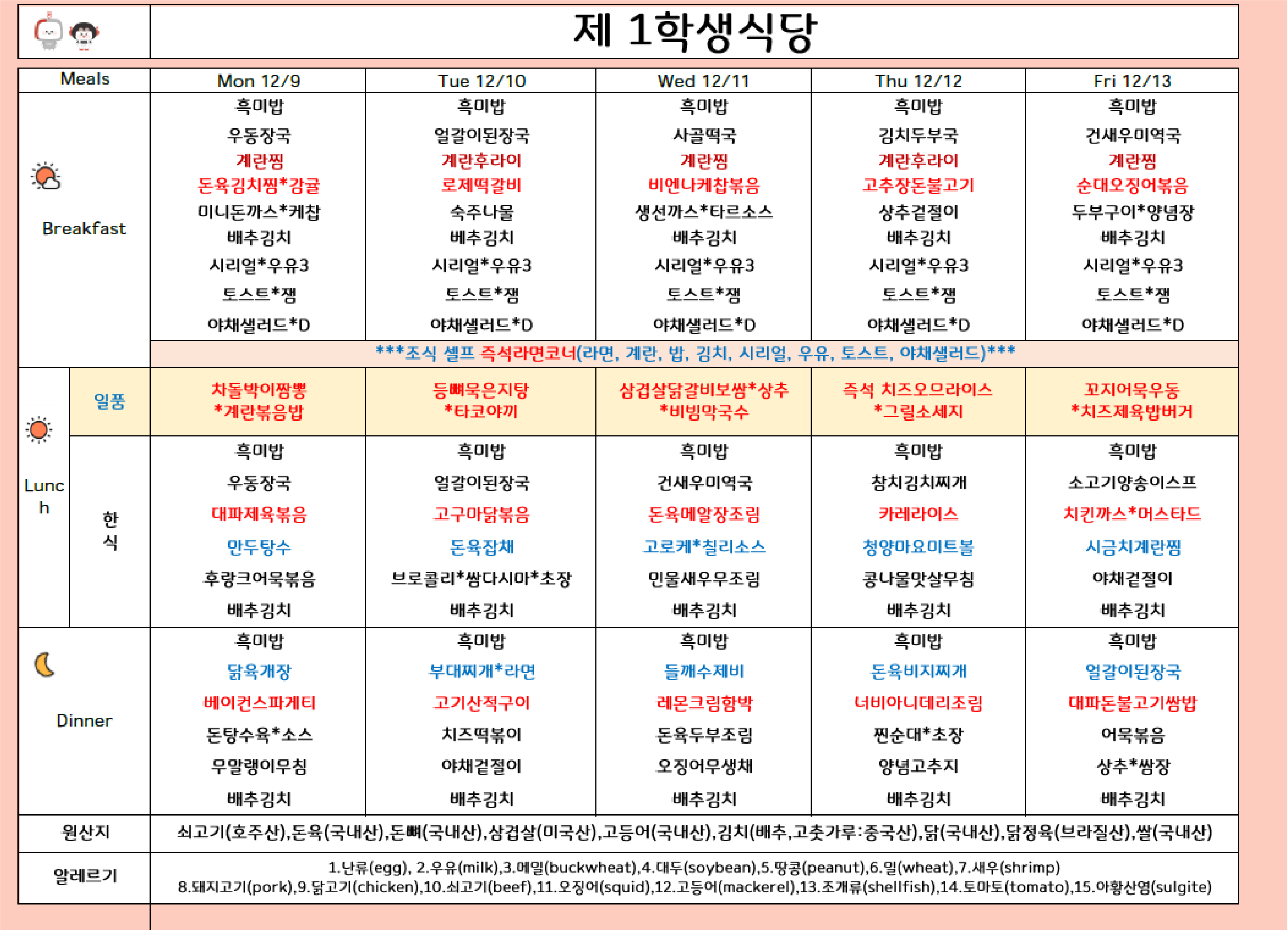 2024년 12월 2주 식단표 ( 12/9 ~12/13)