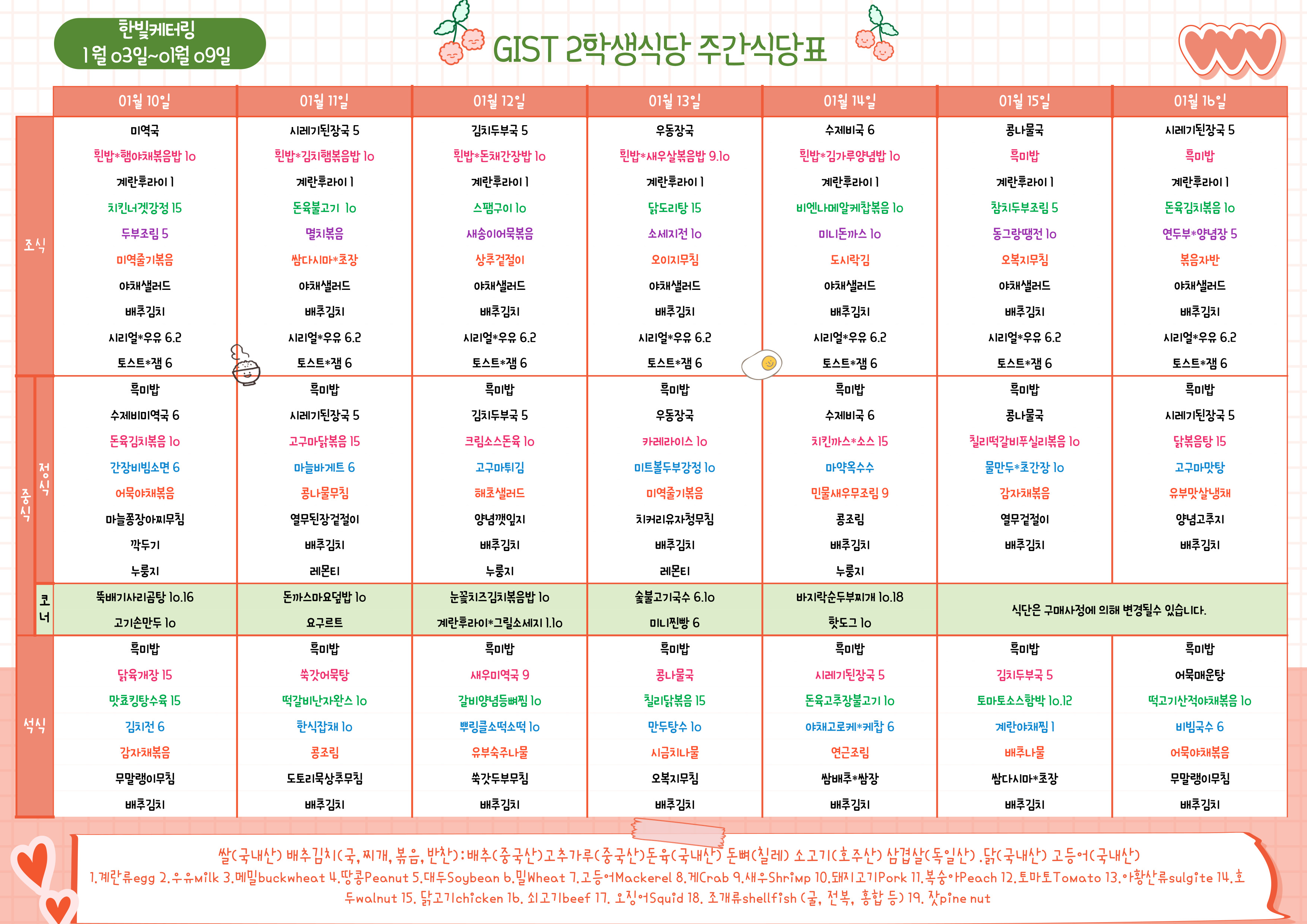 제2학생식당주간식단표(2022.01.10~2021.01.16)