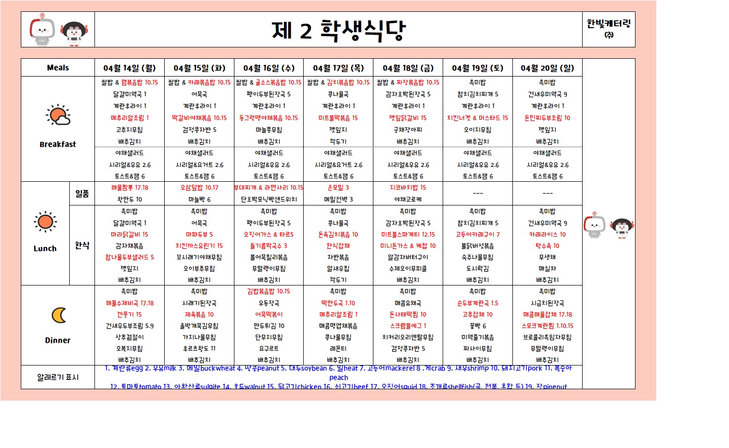 제2학생식당주간식단표(2025.04.14-2025.04.20)