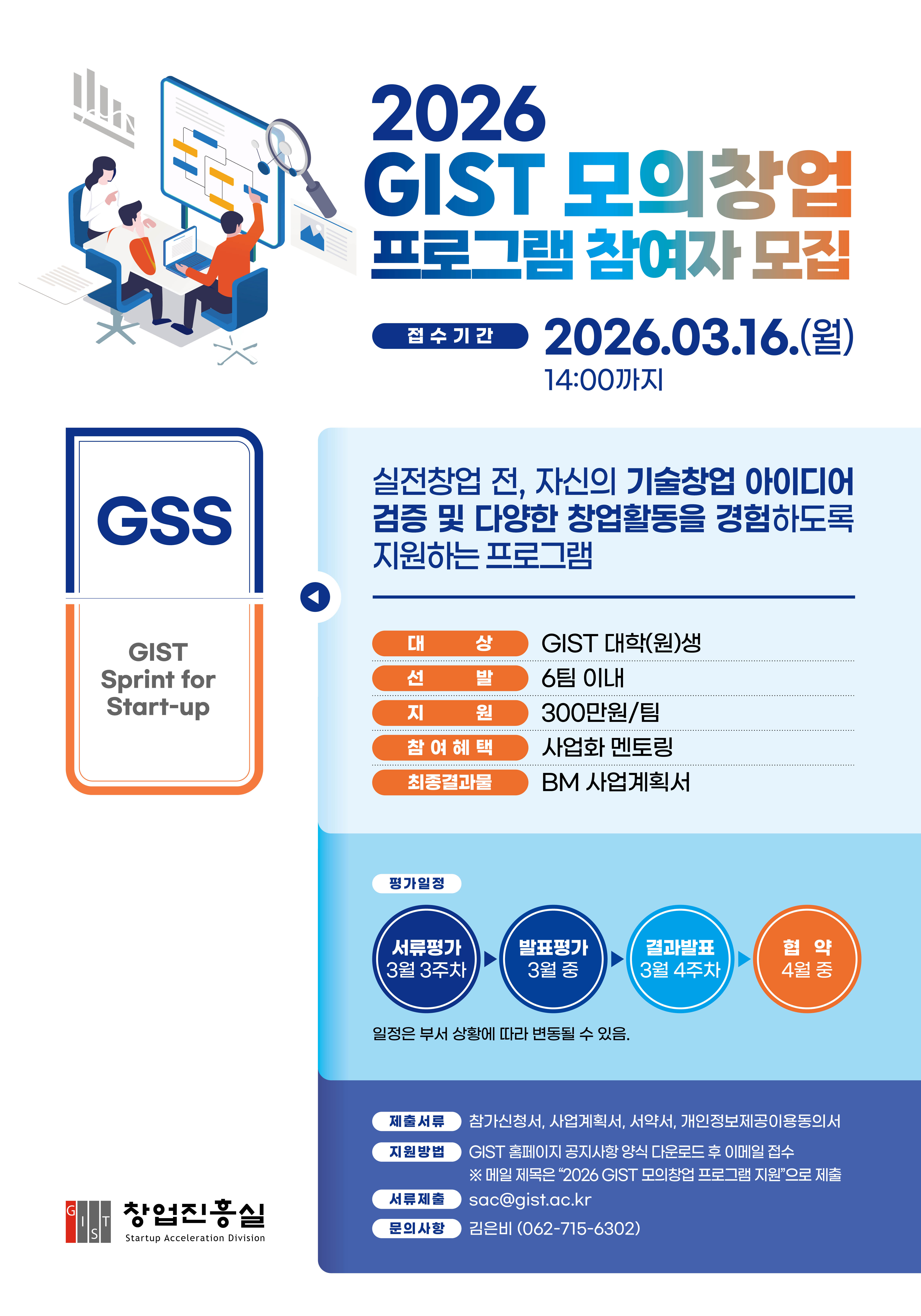 □ 신청방법: 이메일 접수(sac@gist.ac.kr), 메일 제목 "2026 GIST 모의창업 프로그램 지원"으로 제출