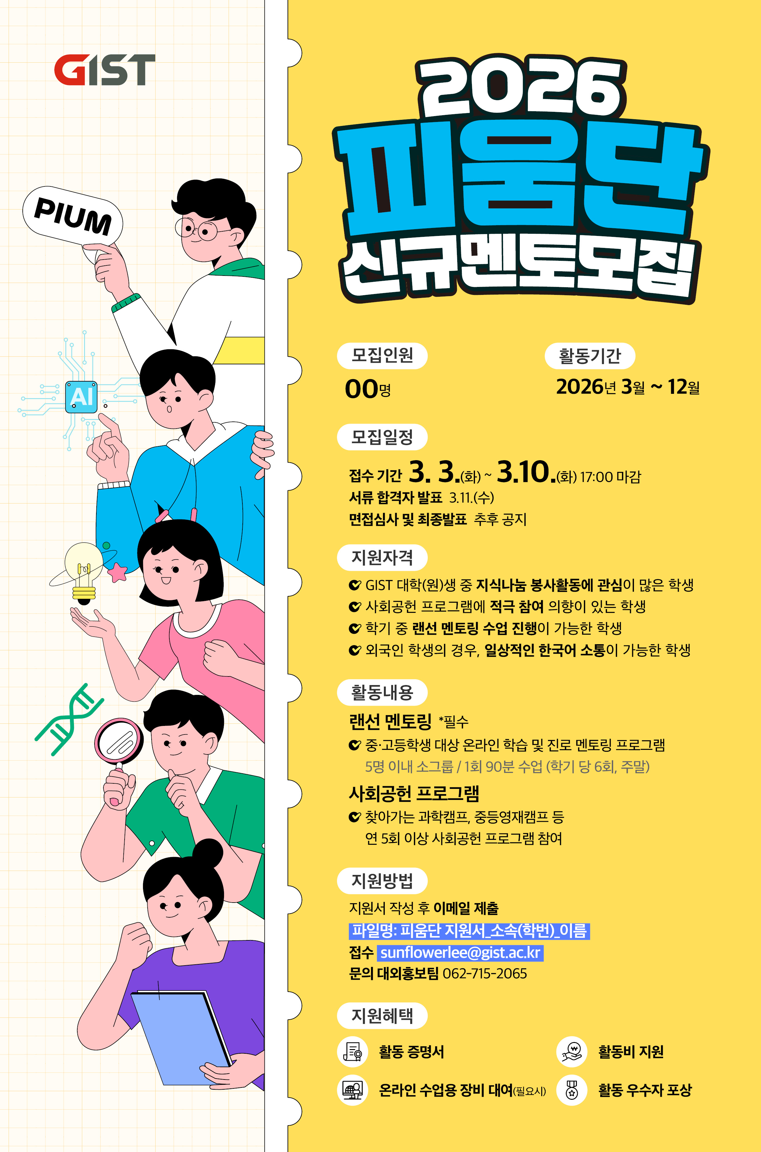 지스트 사회공헌단은 '피움'의 일원으로 함께하며, 지식 나눔을 실천할 멘토를 모집합니다.