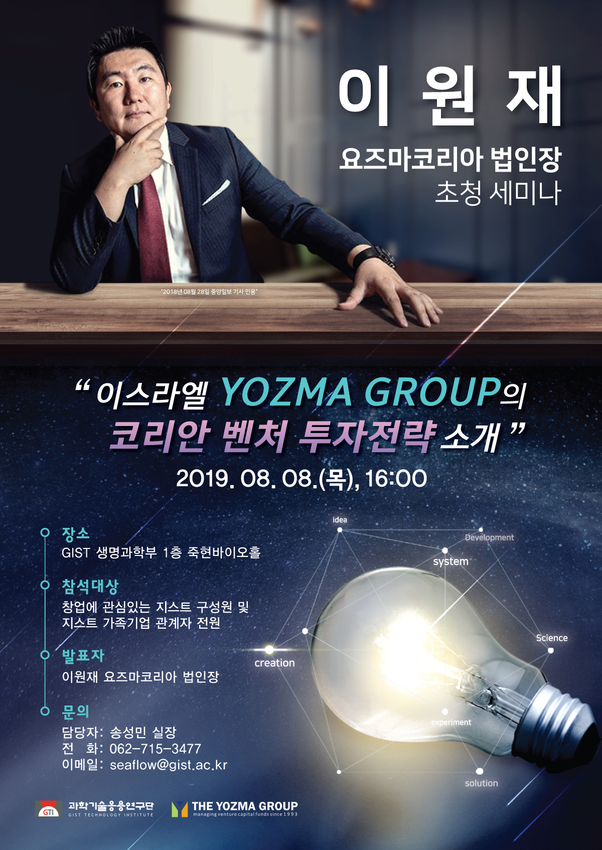 세계 최대 규모의 벤처캐피탈인 YOZMA GROUP의 한국법인장을 초청하여 글로벌 투자사의 관심 기술분야와 투자기업 발굴 시 중점 고려사항에 대한 정보를 공유하고자 합니다. 창업에 관심이 있는 지스트 교원, 학생, 연구원과 VC 투자유치를 희망하는 기업관계자들의 많은 참여를 바랍니다.