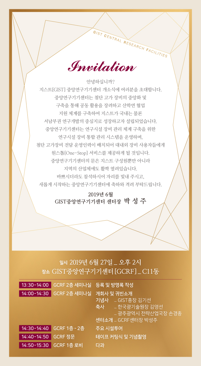 새롭게 시작하는 중앙연구기기센터의 개소식을 개최하고자 하오니 지스트 구성원 여러분들의 많은 참여를 바랍니다.