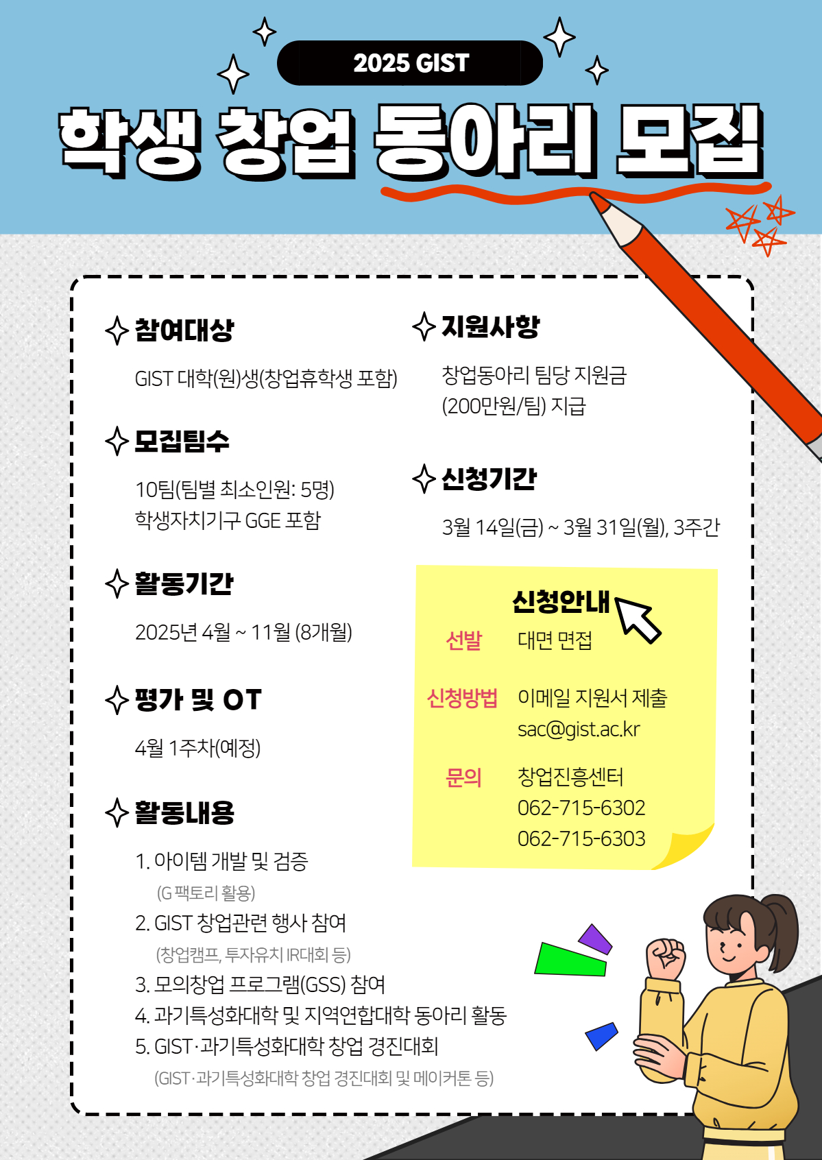 □ 신청방법: 이메일 접수(sac@gist.ac.kr), 메일 제목 "2025년도 창업동아리/창업 서포터즈 지원"