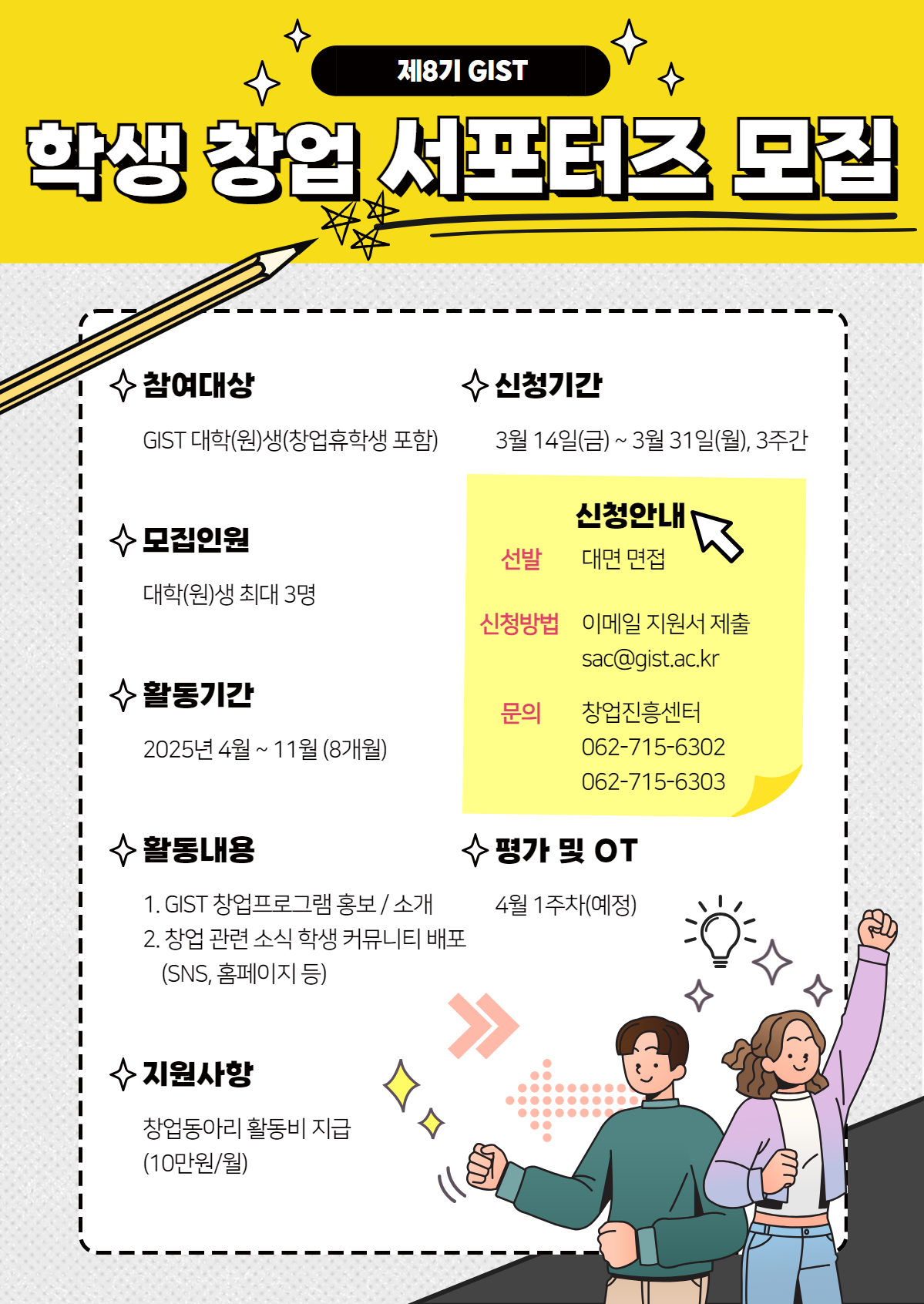 - 창업 서포터즈: GIST 대학(원)생 (창업 휴학생 포함), 최대 3명 선발