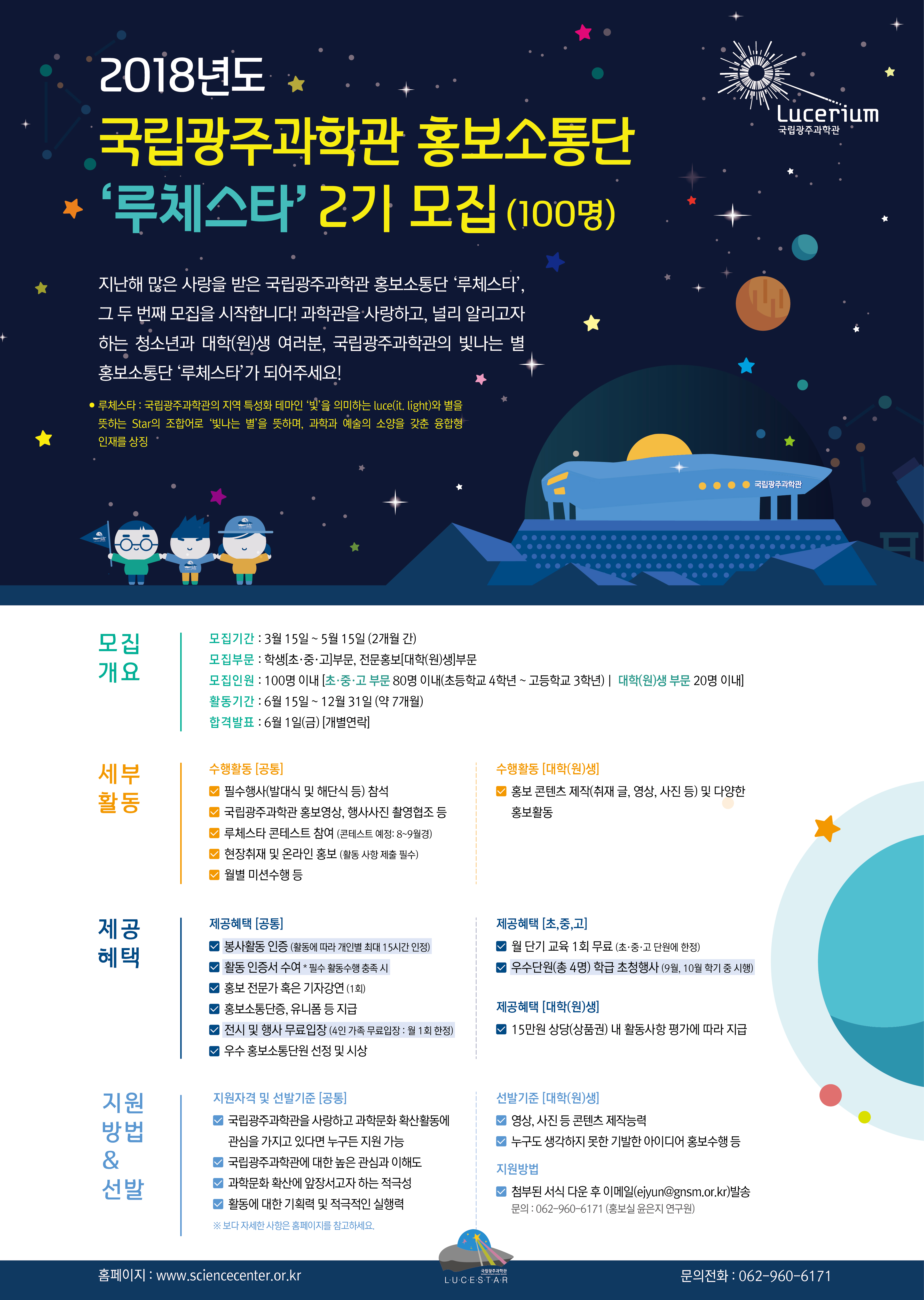 열람중 (국립광주과학관) 홍보소통단 '루체스타' 2기 모집(100명) 박재홍 2018-03-23 3647 첨부파일 다운로드