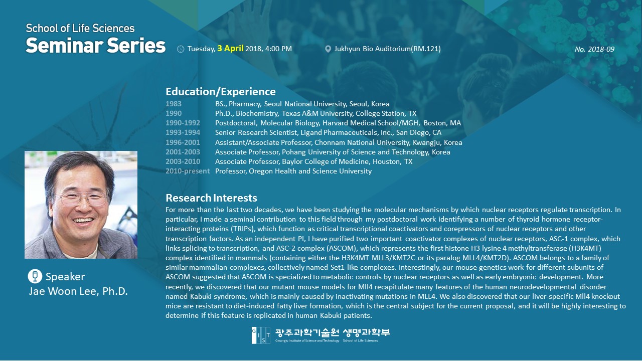 [생명과학부 Seminar-9] 2018.4.3.(Tue) 4:00pm, Jae Woon Lee, PhD