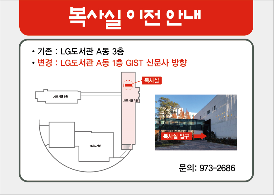 복사실 이전 안내 (LG도서관 A동 1층 GIST 신문사 방향)