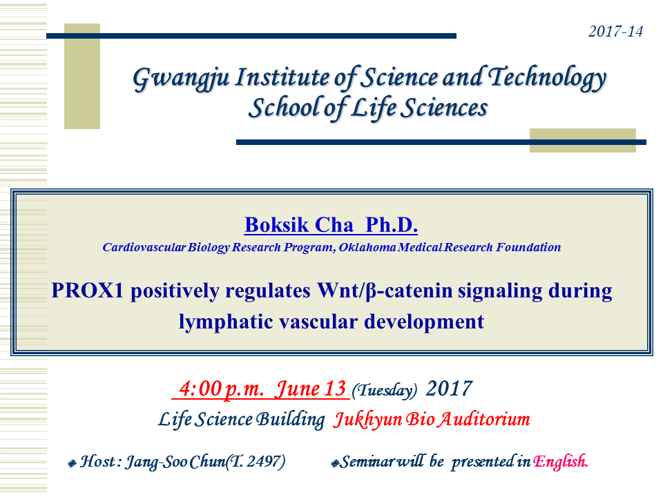 [생명과학부 Seminar] 2017.06.13.(Tue) 4PM, Boksik Cha, Ph.D.