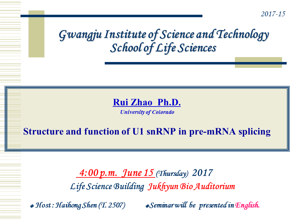 [생명과학부 Seminar] 2017.06.15.(Thu) 4PM, Rui Zhao, Ph.D.