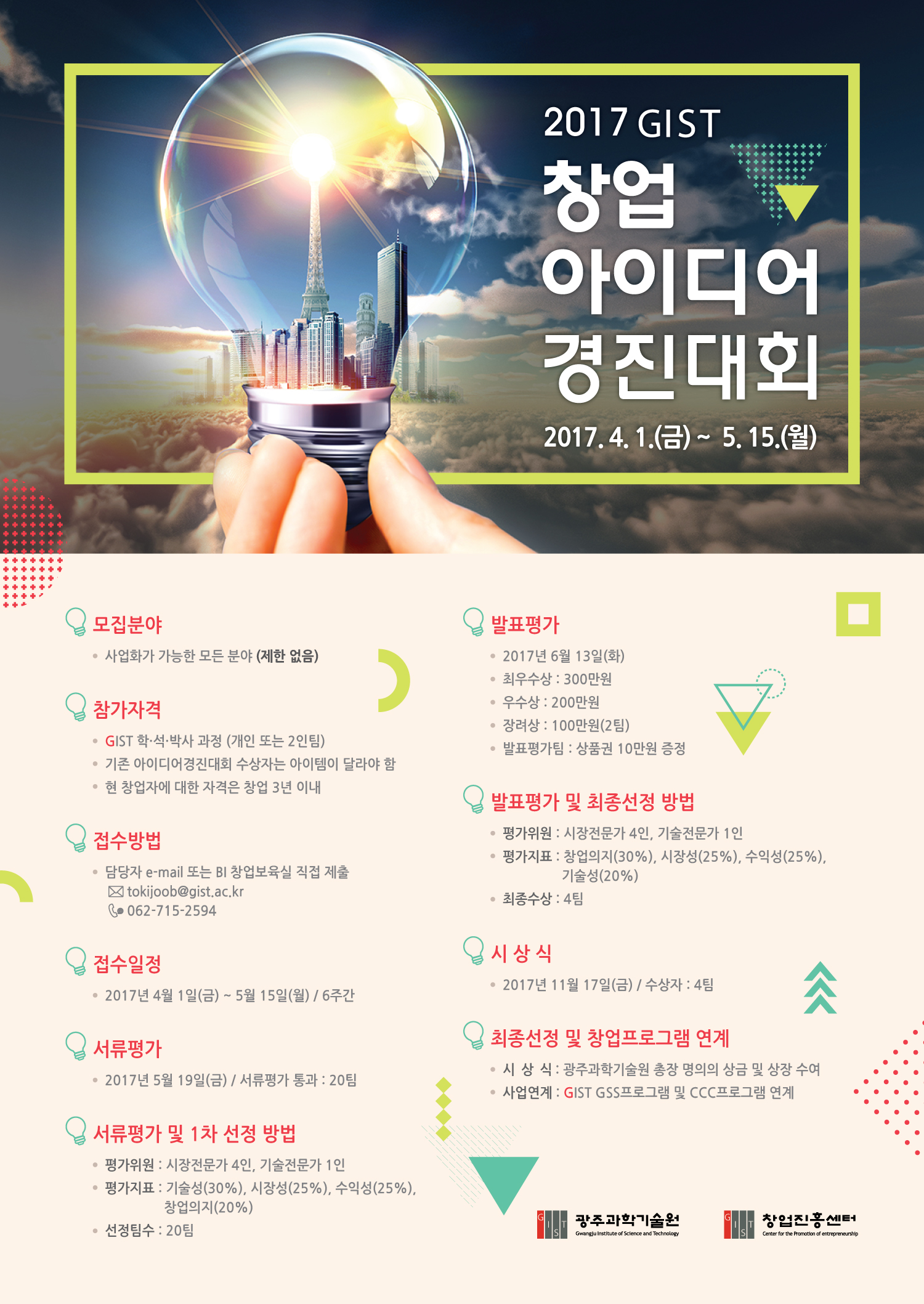 | 참가자격 | - GIST 학·석·박사 과정 (개인 또는 2인팀) - 기존 아이디어경진대회 수상자는 아이템이 달라야 함 - 현 창업자에 대한 자격은 창업 3년 이내 |