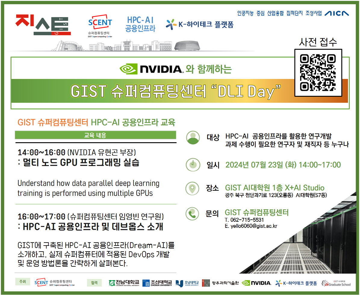 「2024년도 K-하이테크 플랫폼 사업」과 「공용인프라 구축사업」을 주관하는 GIST 슈퍼컴퓨팅센터에서 <NVIDIA와 함께하는 GIST 슈퍼컴퓨팅센터 "DLI Day" (HPC-AI 공용인프라 교육)>을 개최합니다.