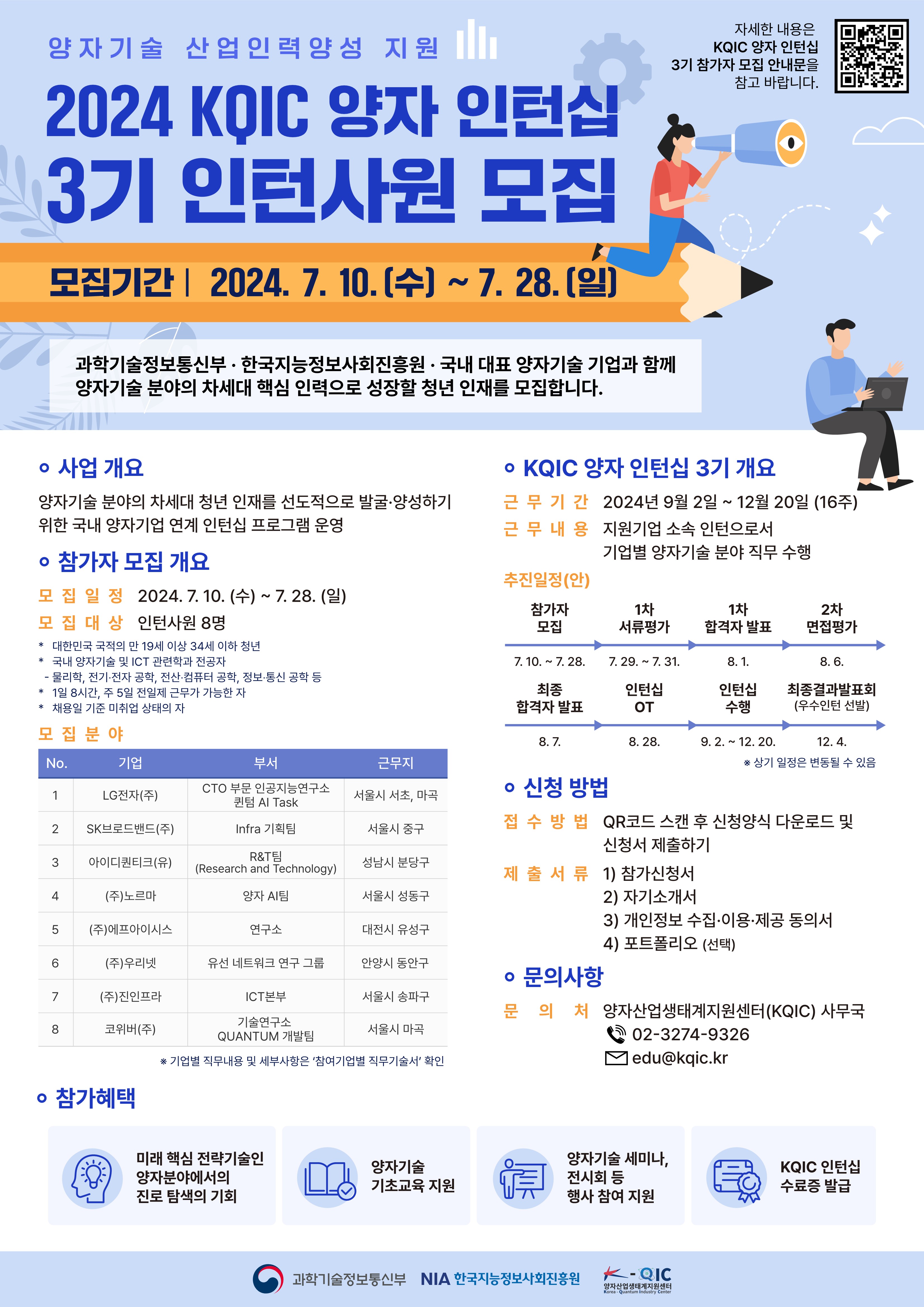 과학기술정보통신부와 한국지능정보사회진흥원 주관 ‘양자기술 산업인력양성 지원’ 사업의 일환으로 ‘KQIC 양자 인턴십 3기' 참가자(인턴사원)을 모집합니다.