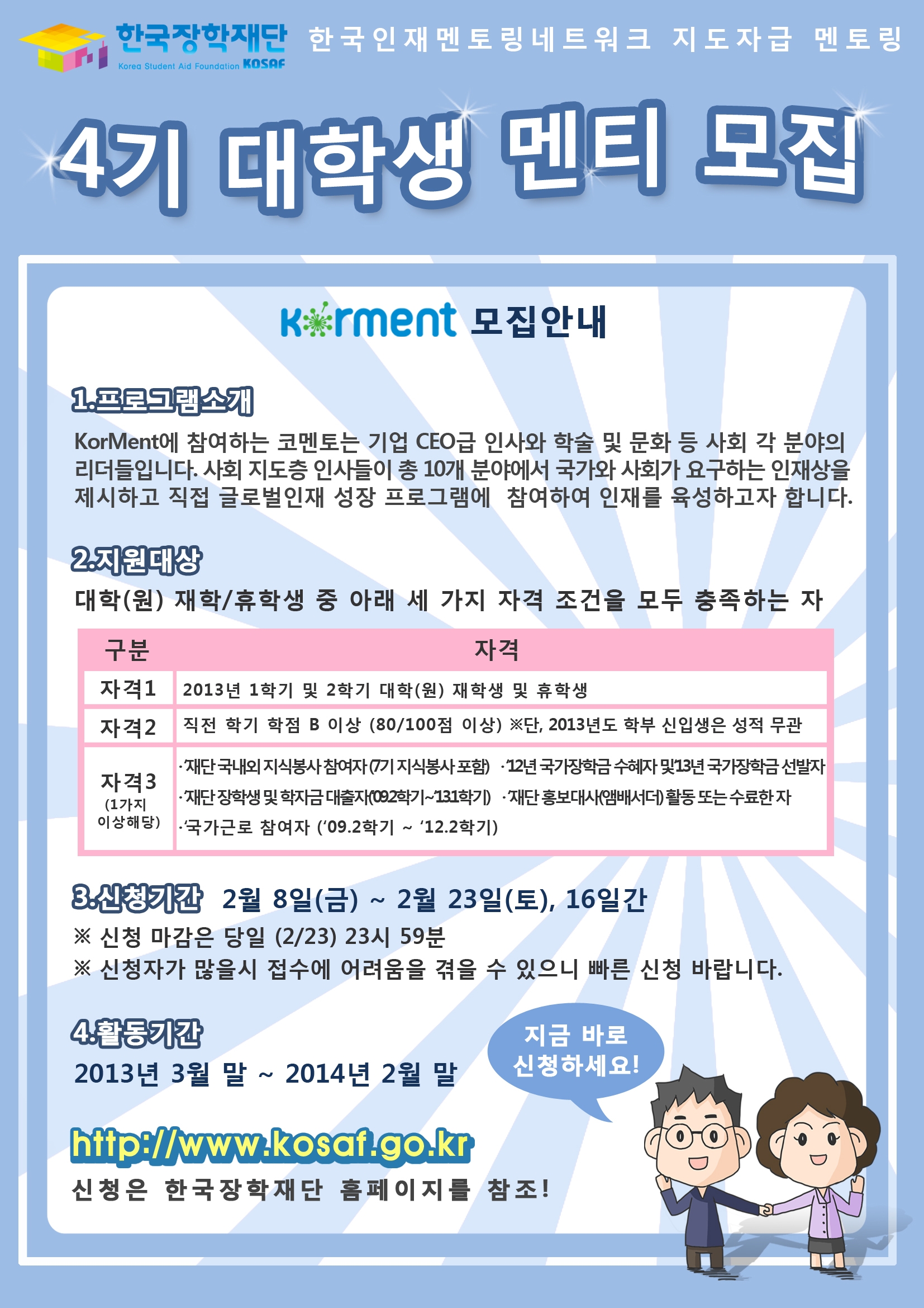 ❍ 신청 기간 : ’13년 2월 8일(금) ~ 2월 23일(토), 16일간 ※ 신청 마감은 당일 (2/23) 23시:59분 ※ 신청자가 많을시 접수에 어려움을 겪을 수 있으니 빠른 신청 바랍니다. ❍ 신청 방법 : 한국장학재단 홈페이지 (http://www.kosaf.go.kr) 1) 한국장학재단 홈페이지 회원 가입 (기존회원은 로그인) 2) 재단 홈페이지-인재육성지원-지도자급멘토링 신청하기 3) 분과별 주제 및 코멘토 현황 확인 후 1,2,3지망 신청 4) 자기 소개서 작성 후 제출 (최종 제출 후 수정 불가) ※ 2, 3지망 지원에는 인원제한이 있으니 빠른 제출바랍니다. (1지망은 제한 없음) ※ 신청시 반드시 활동 지역을 확인한 후 신청 (별도의 교통비 지원 없음) ❍ 제출 서류 : 온라인 제출 1) 필수 제출 : 제출용 성적 증명서(백분율 환산) 1부 *2013년 1월8일~2월23일 발급만 인정* 2) 선택 제출 : 봉사활동 및 기타 경력사항 증명서 1부 (스캔/사본 인정) | |||||||||||||||||||||||||||