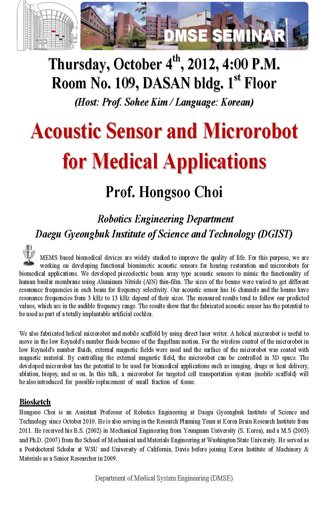 [DMSE Seminar] *10/4(Thu) 4:00P.M. / Acoustic Sensor and Microrobot for Medical Applications / Prof. Hongsoo Choi / Dasan Bldg.#109