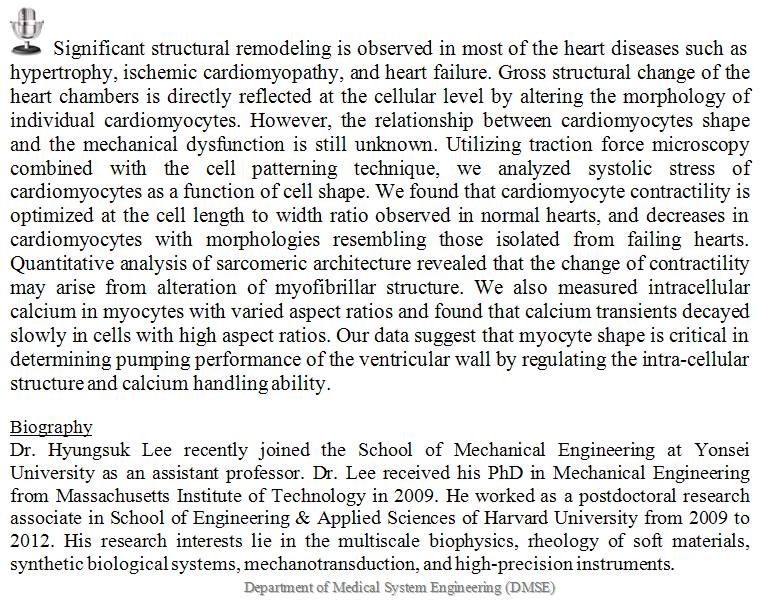 [DMSE Seminar] 5/25(Fri) *2:00P.M. / Cell shape regulates structure and function of cardiac myocytes / Dr.Hyungsuk Lee / Dasan Bldg. #109 / Korean