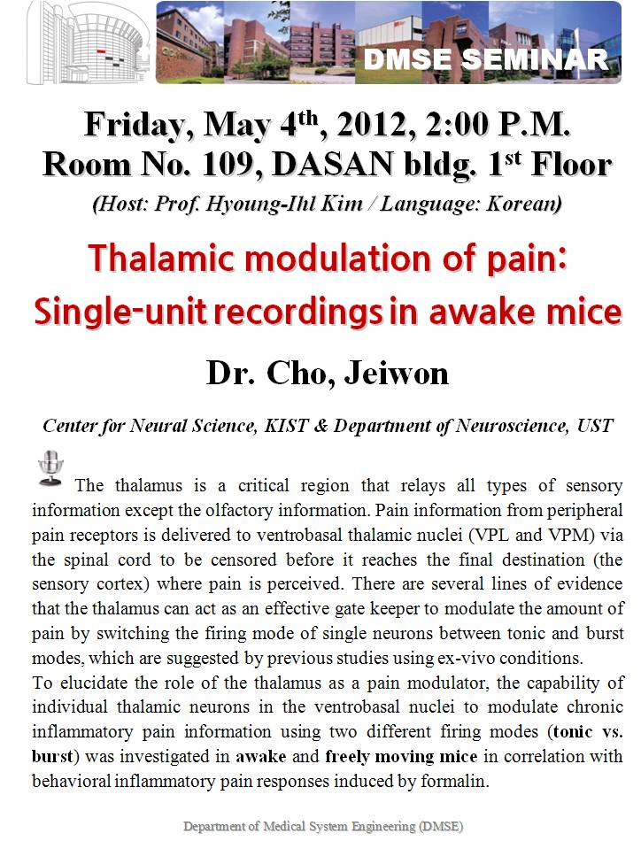 [DMSE Seminar] 5/4(Fri) 2:00P.M. / Dr. Cho, Jeiwon / Thalamic modulation of pain: Single-unit recordings in awake mice / Language: Korean