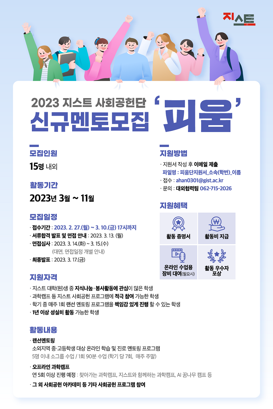 - 지스트 대학(원)생 중 나눔 및 교육 봉사활동에 관심이 많은 학생