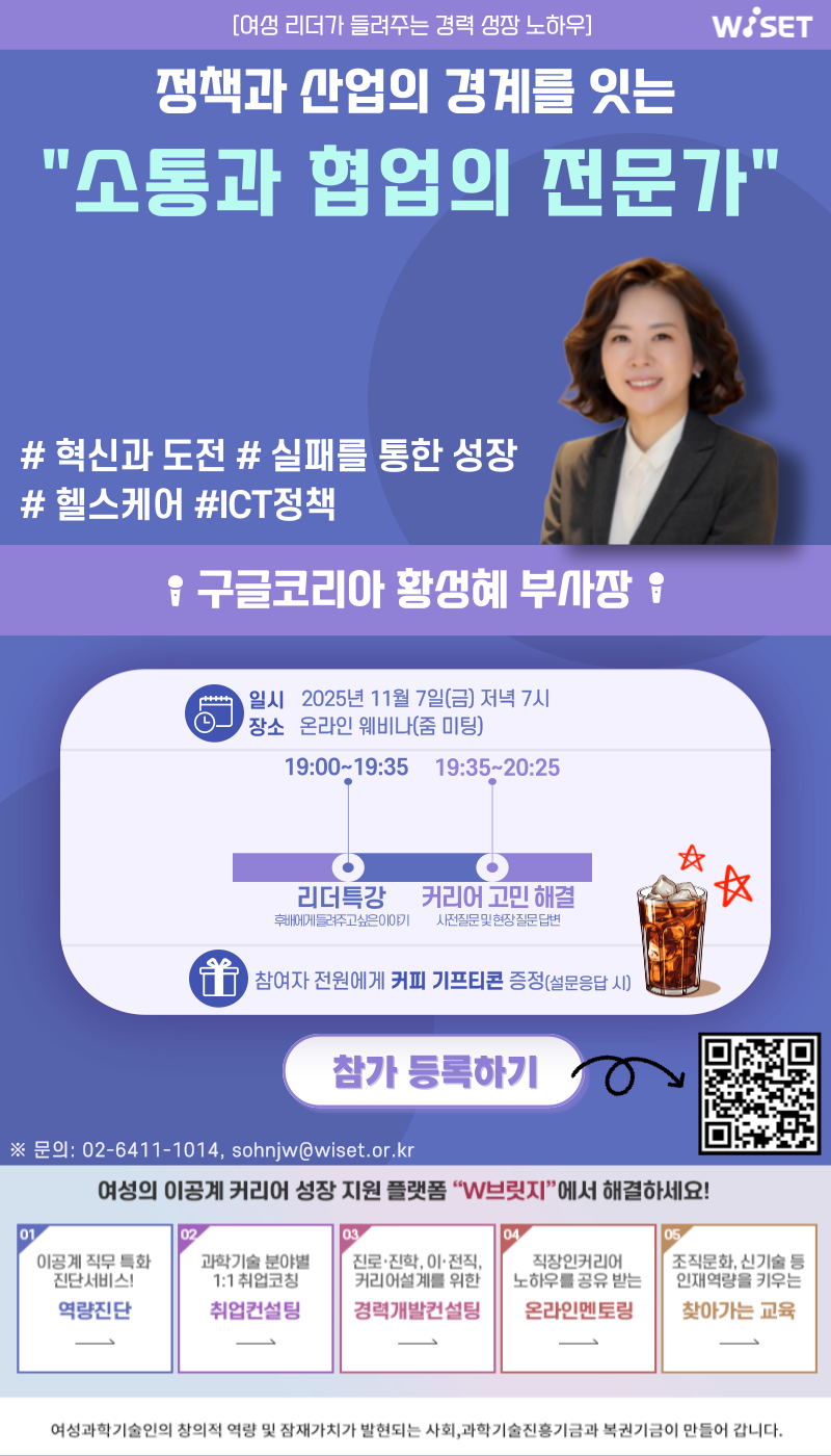 한국여성과학기술인육성재단(WISET)에서는 중간 관리자급 여성 재직자의 경력성장 멘토링을 위해 「WISET 여성리더 TALK」 특강을 진행하오니, 관심있는 분들의 많은 참여 바랍니다.