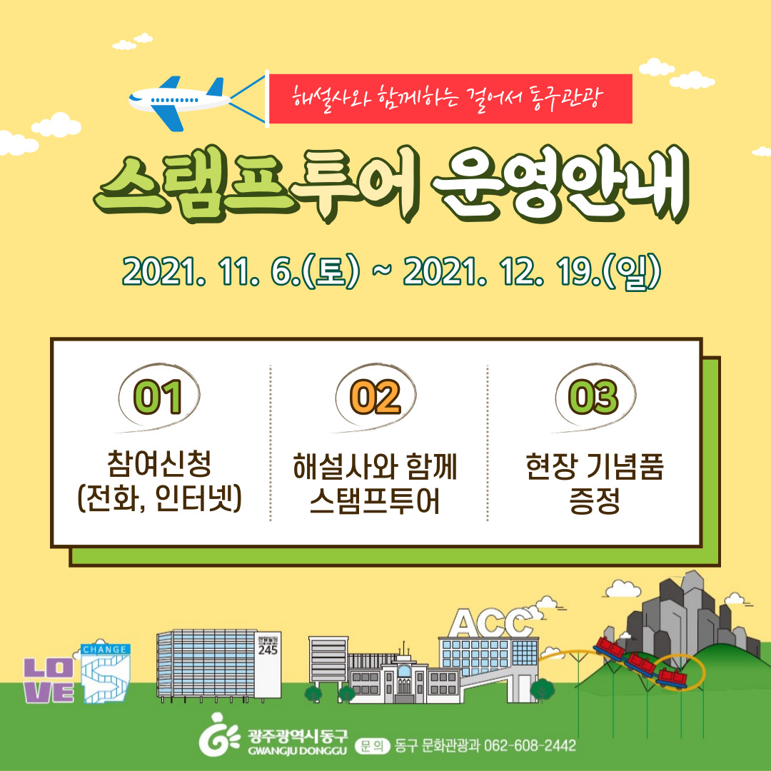 - 투어코스 : 전일빌딩 → 5.18 민주광장 → 구도청본관 → ACC 야외미디어아트 → 하늘마당 → 동명동 빛의상자 → 뷰폴리