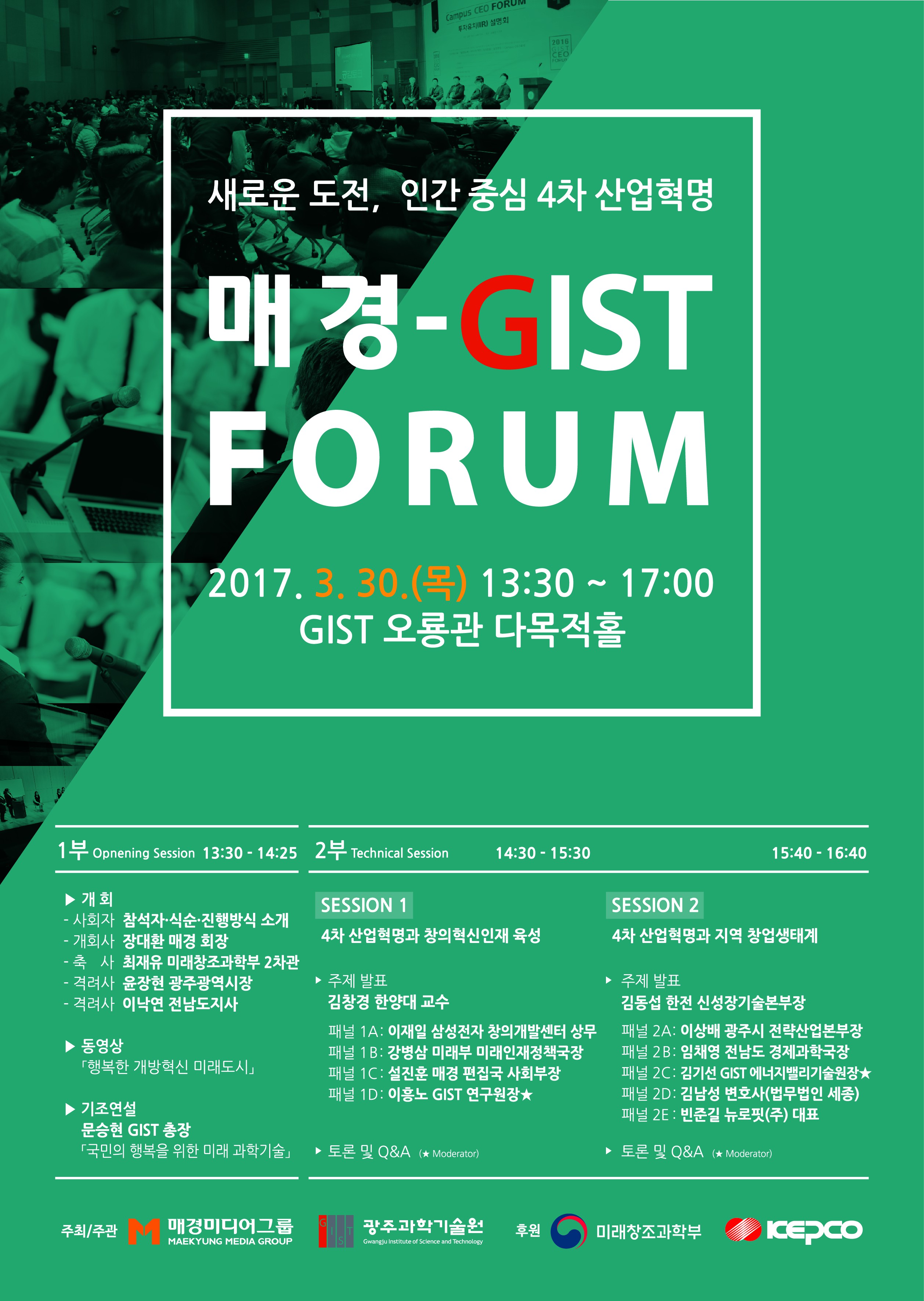GIST와 매경미디어그룹이 "4차 산업혁명"을 주제로「매경-GIST 포럼」을 개최합니다.
