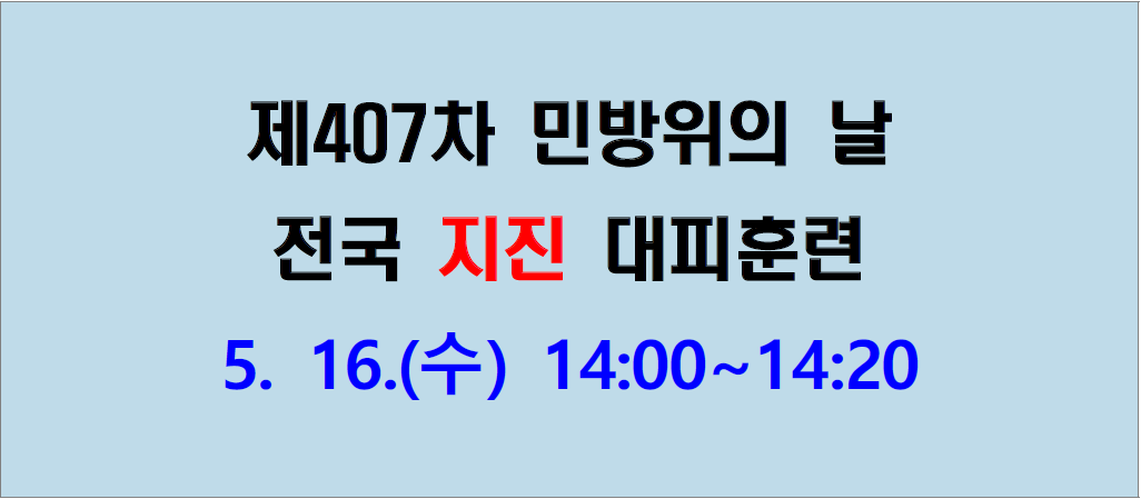 제407차 민방위의 날(5.16) 전국 지진 대피훈련 계획을 안내합니다.