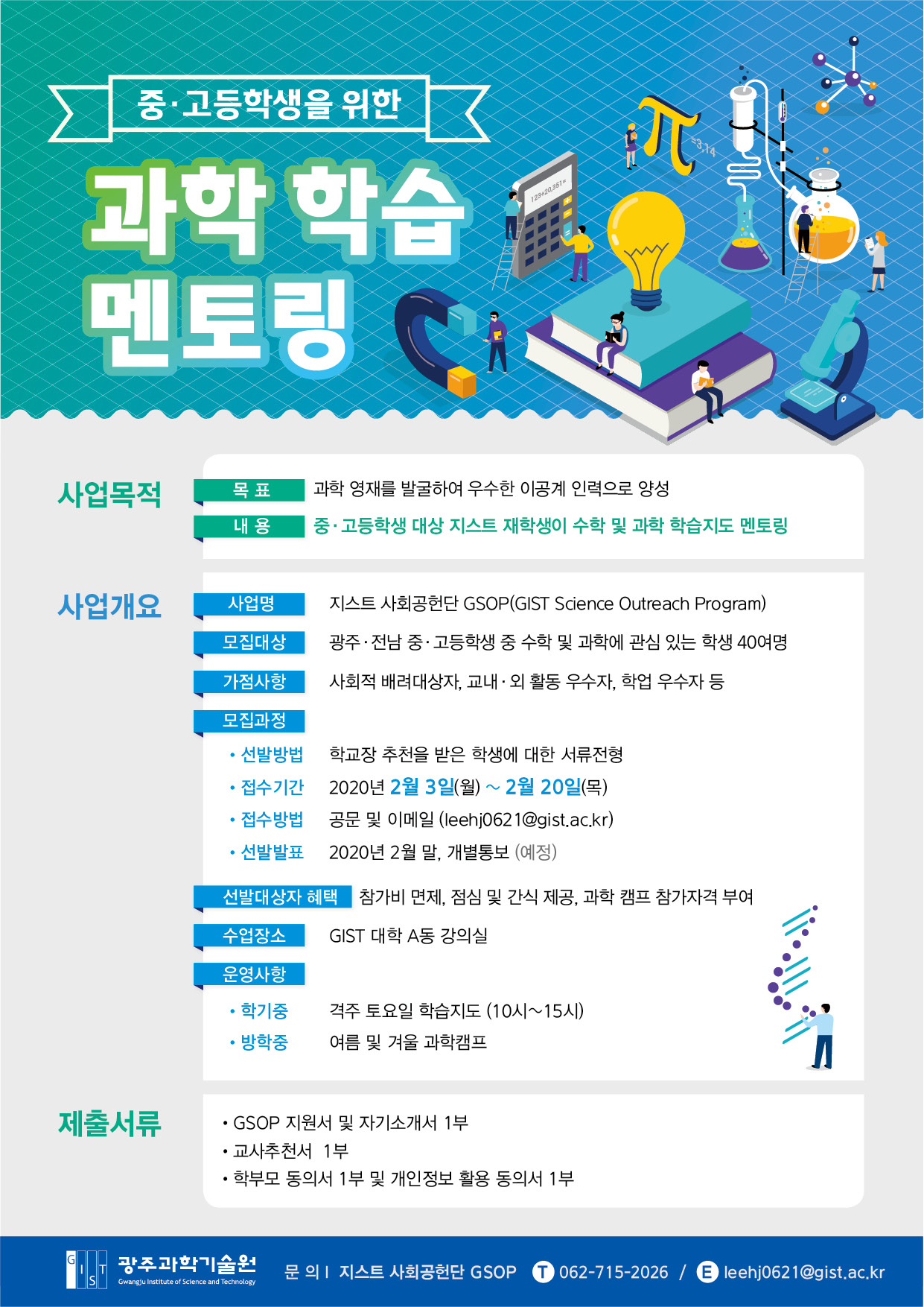 ○ 프로그램명: 지스트 사회공헌단 GSOP(GIST Science Outreach Program) ○ 모집대상: 광주·전남 지역 중·고등학생 중 수학 및 과학에 관심 있는 학생 ○ 가점사항: 사회적 배려대상자, 교내·외 활동 우수자, 학업 우수자 등 ○ 모집과정 · 선발방법: 학교장 추천을 받은 학생에 대한 서류전형 · 접수기간: 2020년 2월 3일∼ 2월 20일(목) · 접수방법: 공문 및 이메일(leehj0621@gist.ac.kr) ○ 운영사항 · 학기중: 격주 토요일 학습지도 멘토링 총 14회 · 방학중: 여름 및 겨울 과학캠프 ○ 제출서류: 지원서 1부, 자기소개서 1부, 교사추천서 1부, 학부모 동의서 및 개인정보활용동의서 1부. |