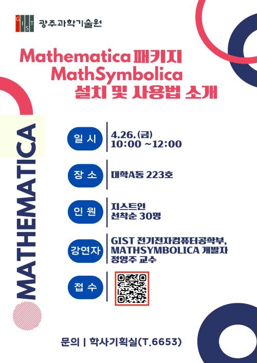 안녕하세요. 학사기획실입니다. 수식 연산 프로그램인 MathSymbolica 사용법을 알려드리는 강연이 열립니다. 강연 중 다변수 함수, 선형대수, 미분방정식에 관한 해결책을 제시해 드리오니 실전 문제에 대한 해답을 알 수 있는 기회를 놓치지 마시기 바랍니다. 자리는 선착순 30명으로 한정되어 있으니 빠르게 신청 부탁드립니다. * 신청 기간: 4.18.(목) 09:00~4.24.(수) 18:00 가. 주제: Mathematica 패키지, MathSymbolica 설치 및 사용법 소개 나. 일시: 2024.4.26. (금) 10:00~12:00 다. 장소: 대학 A동 223호 라. 강연자: 정영주 교수(GIST 전기전자컴퓨터공학부 교수, MathSymbolica 개발자) 마. 대상: 지스트 학생 및 구성원(30명 선착순) 바. 오프라인 교육 및 실습(한국어 강의) 사. 홈페이지: www.mathsymbolica.com 아. 준비 사항: 4월 24일 오후 6시까지 Q코드 네이버 폼으로 신청(이름과 이메일 주소) 및 Mathematica 사전 설치 자. 기타: Mathematica를 사용하여 풀려고 하는 문제가 있으신 분은 'QR코드 신청자 응답 페이지 내 4번 문항'에 답변해주시면 강연할 때 해결책을 제시해 드립니다. 참석자 샌드위치 및 음료 배부 예정, 충전케이블 증정