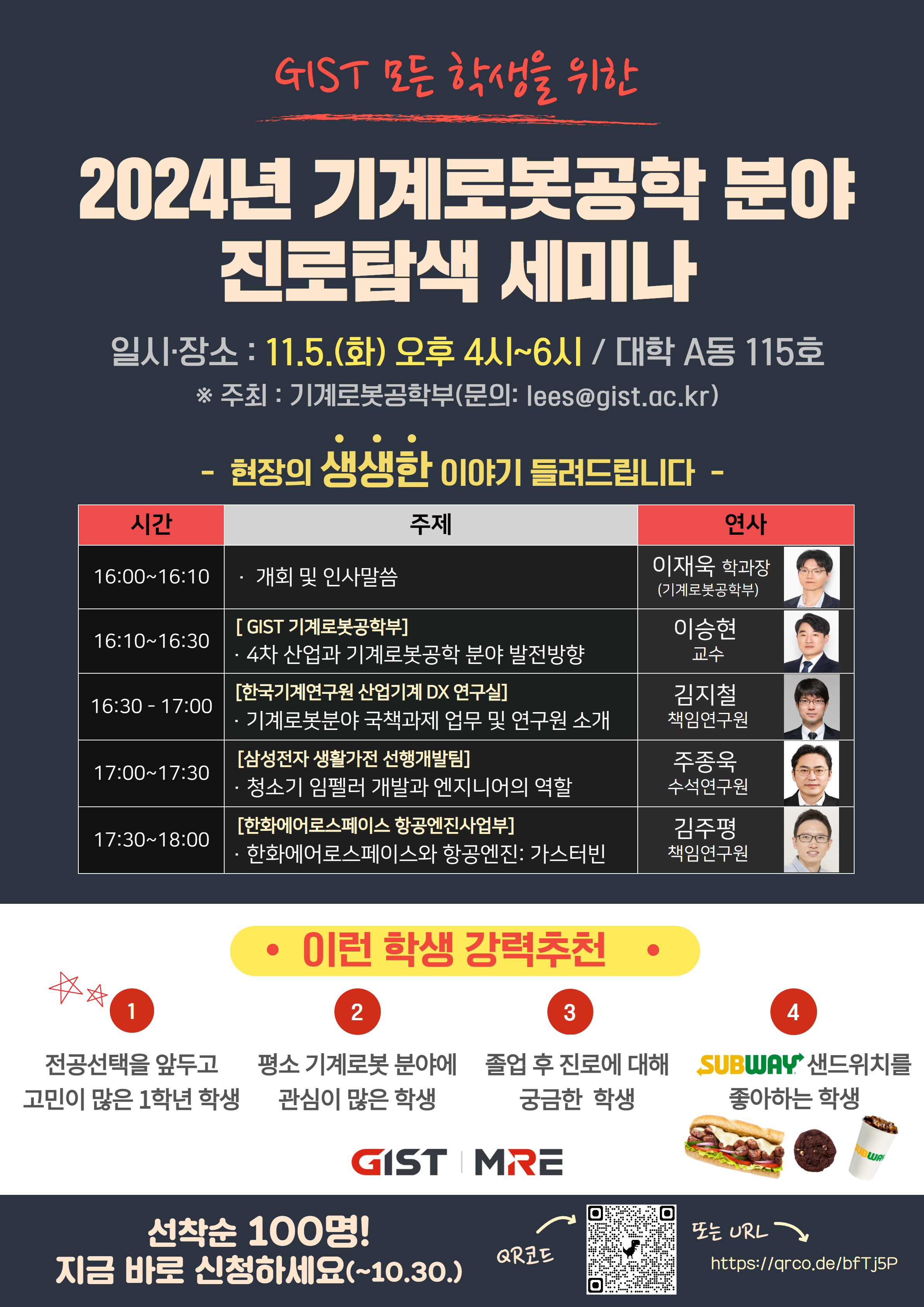 4차 산업을 선도하는 기계로봇공학 분야와 관련하여 학계, 연구소, 산업체 등 다양한 진로를 안내하여, GIST 학생들