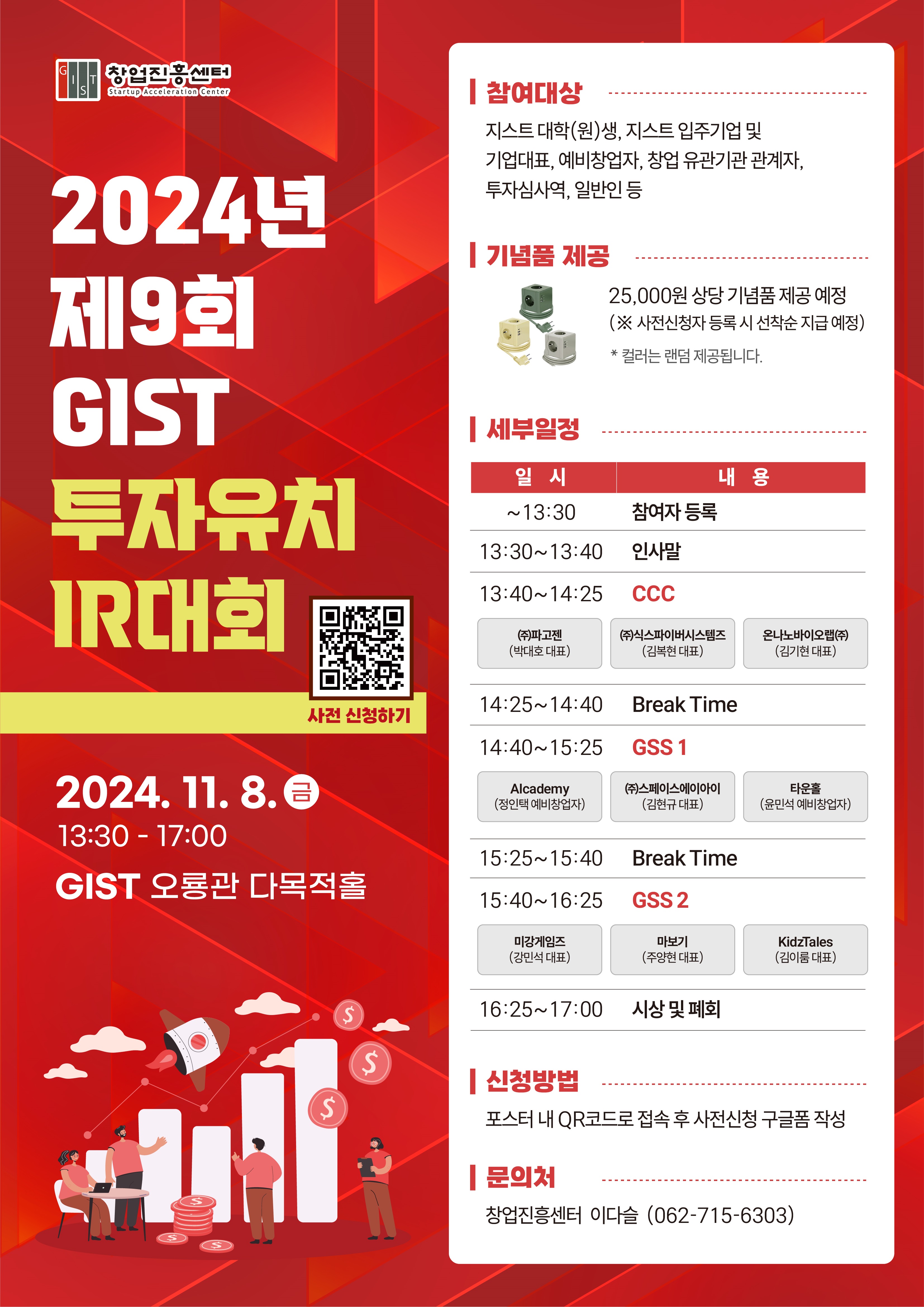 2024년도 과학문화주간을 맞아 제9회 GIST 투자유치 IR대회를 개최하고자 합니다.