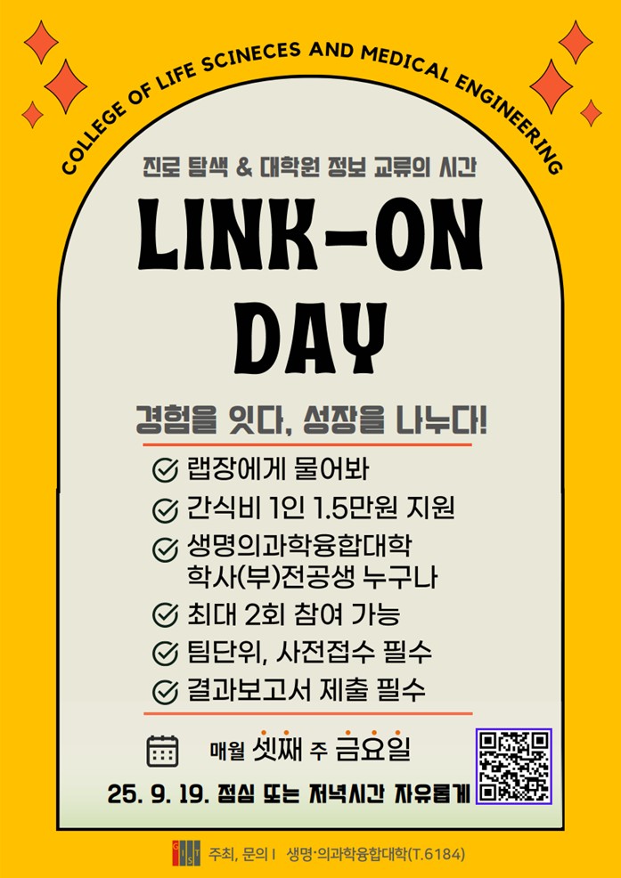 학과생과 대학원생 간의 소통과 교류를 위해 매달 셋째 주 금요일에 "LINK-ON DAY"를 정기적으로 개최하고자 합니다.