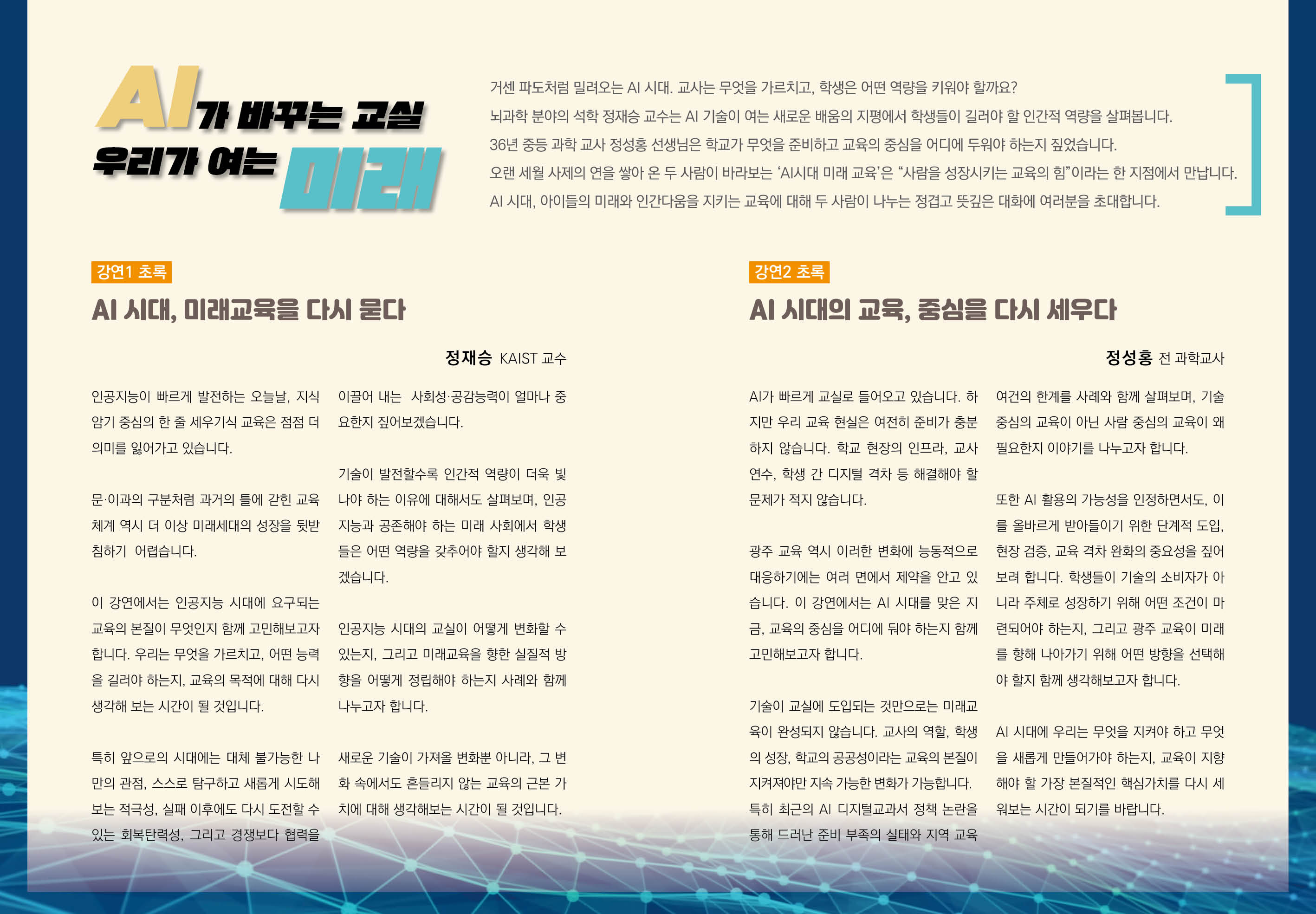 강연에 이은 사제 토크에서는 AI 시대 교사의 역할과 학생이 갖춰야 할 미래 역량, 디지털 격차와 광주교육의 과제 등을 중심으로 이야기가 펼쳐진다.