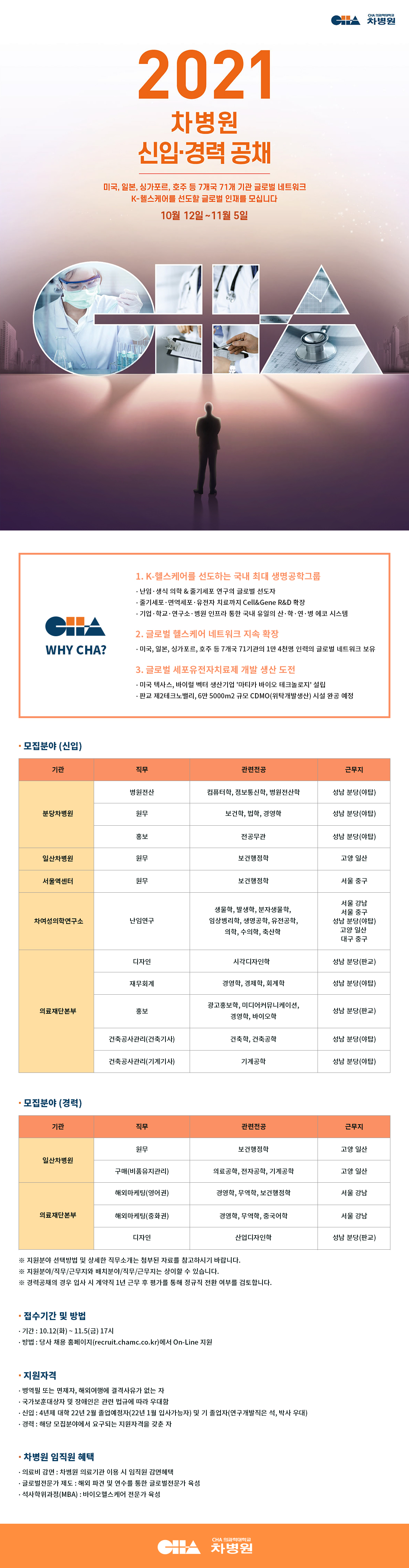 [차병원] 2021 하반기 차병원 신입·경력 공개채용 ( ~ 11/5)