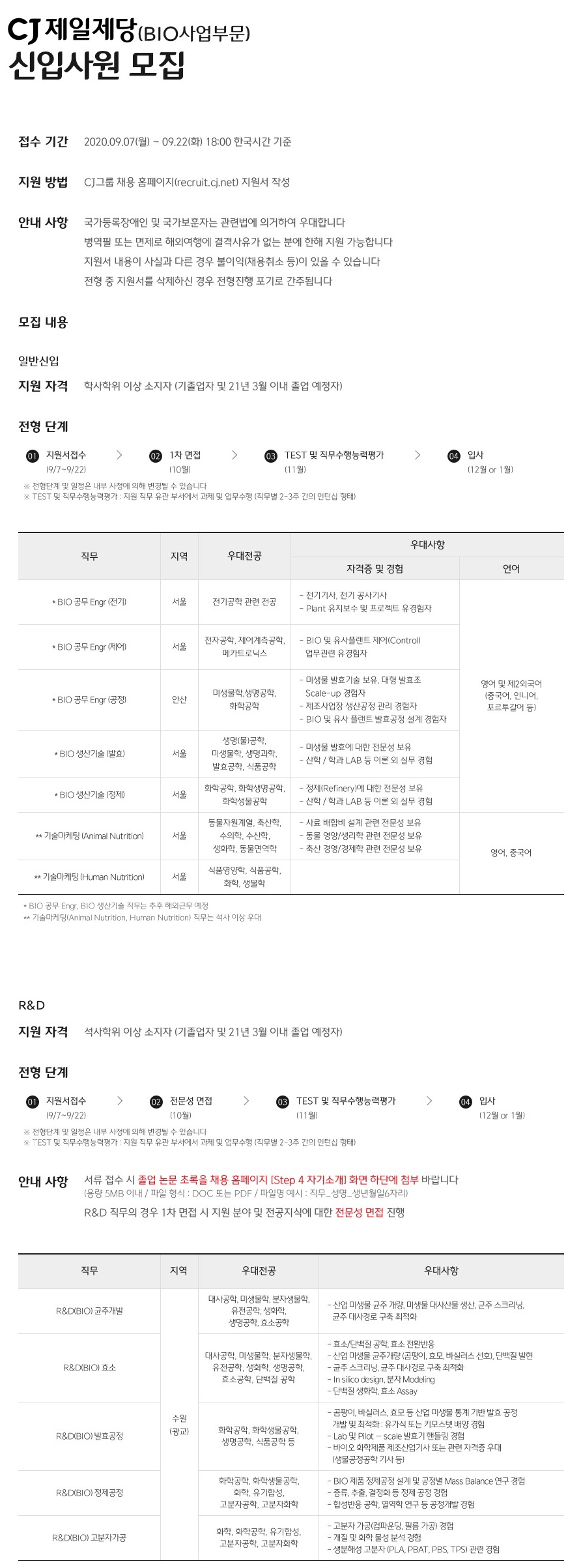 3) BIO사업부문 접수 링크: http://recruit.cj.net/recruit/ko/recruit/recruit/detail.fo?zz_jo_num=5873