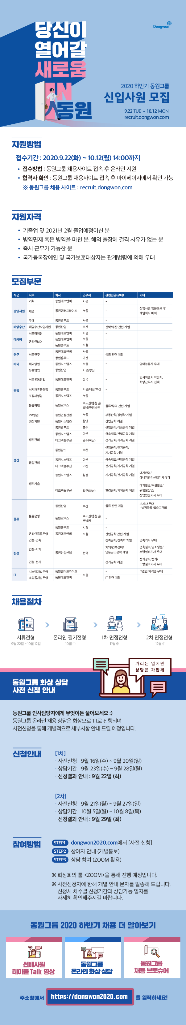 신청결과 안내 : 9/29(화※ 2020 하반기 동원그룹 신입 채용에 대해 더 자세히 알아보세요.