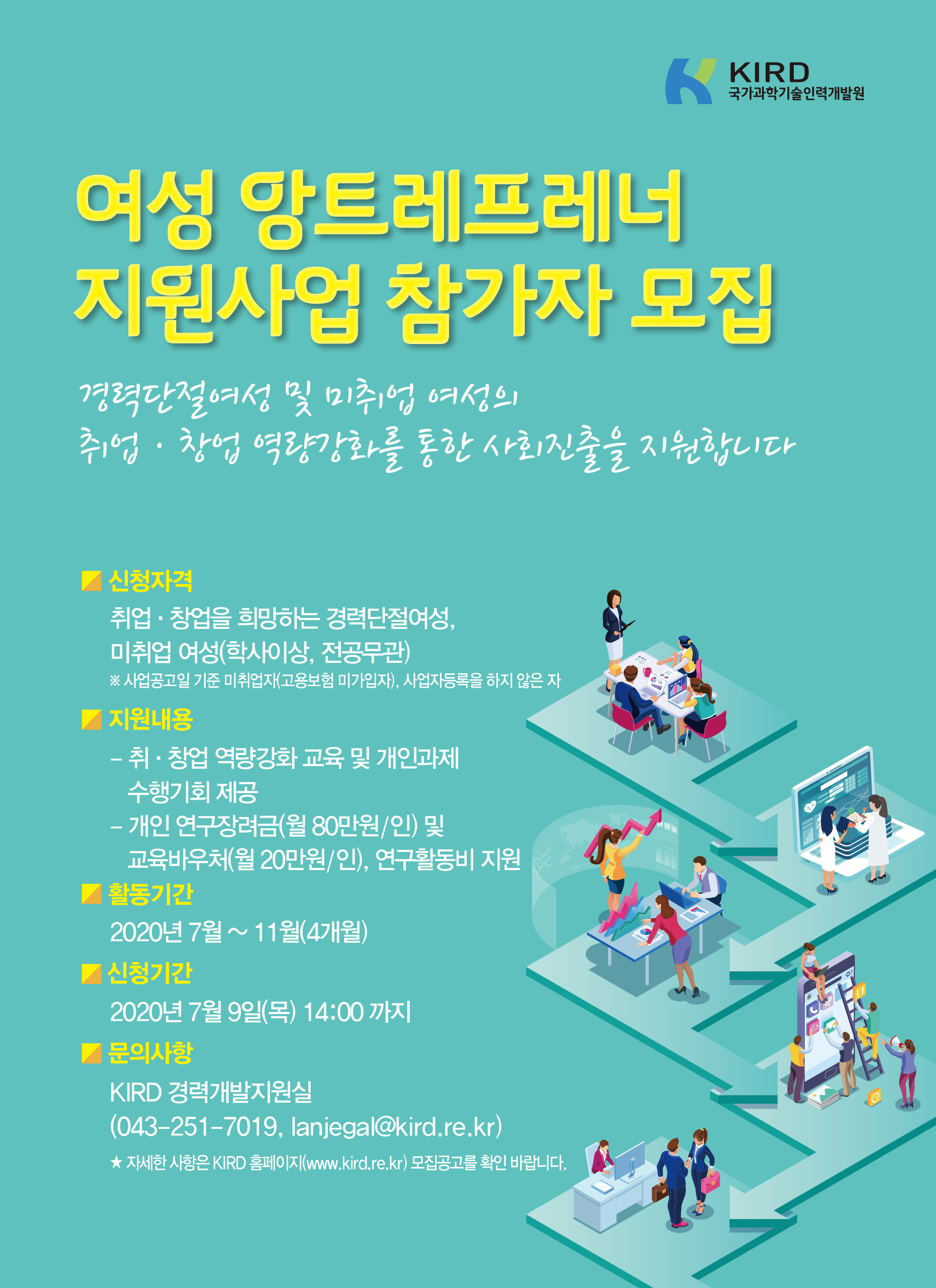 KIRD 국가과학기술인력개발원 여성 앙트레프레너 지원사업 참가자 모집 경력단절여성 및 미취업 여성의 취업 창업 역량강화를 통한 사회진출을 지원합니다 | 신청자격 취업 창업을 희망하는 경력단절여성, 미취업 여성(학사이상, 전공무관) ※ 사업공고일 기준 미취업자(고용보험 미가입자), 사업자등록을 하지 않은 자 지원내용 - 취·창업 역량강화 교육 및 개인과제 수행기회 제공 - 개인 연구장려금(월 80만원/인) 및 교육바우처(월 20만원/인), 연구활동비 지원 | 활동기간 2020년 7월 ~ 11월(4개월) | 신청기간 2020년 7월 9일(목) 14:00 까지 | 문의사항 KIRD 경력개발지원실 (043-251-7019, lanjegal@kird.re.kr) ★ 자세한 사항은 KIRD 홈페이지(www.kird.re.kr) 모집공고를 확인 바랍니다.