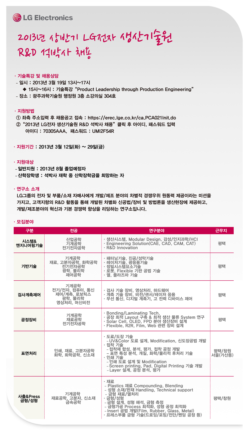 -13시 ~ 15시 : 대학원생 대상 1:1 채용상담(기계공학, 전기전자, 캄퓨터공학, 재료공학 등)