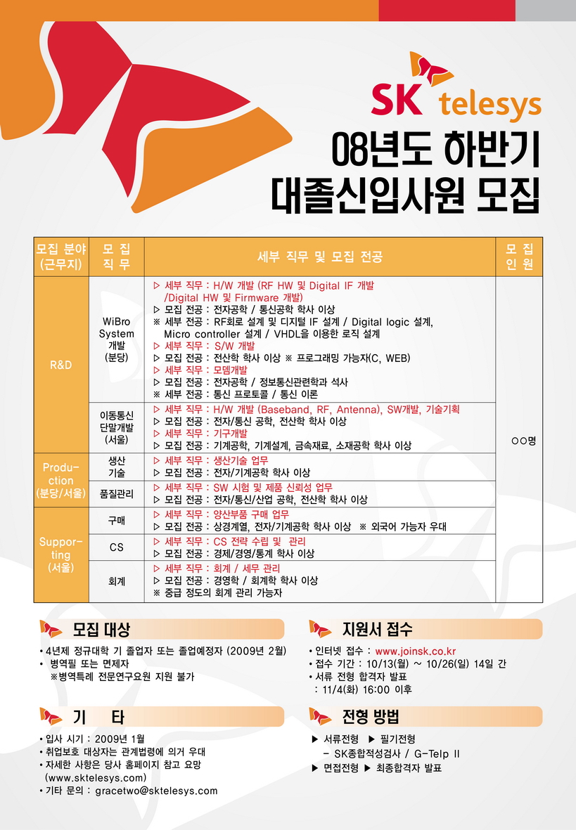 SK telesys(http://www.sktelesys.com)의 2008년도 하반기 신입사원 모집 관련내용을 첨부하오니 참고하시기 바랍니다.** 문 의 : SK텔레시스 전략기획실 인력운영팀 대리 이은혜 (Tel : 02-2129-1831 // E-mail : gracetwo@sktelesys.com)