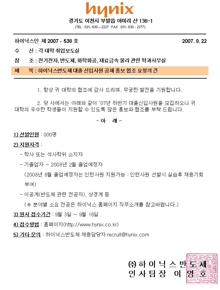 하이닉스(hynix)반도체에서는 아래와 같이 채용 및 캠퍼스 리쿠르팅을