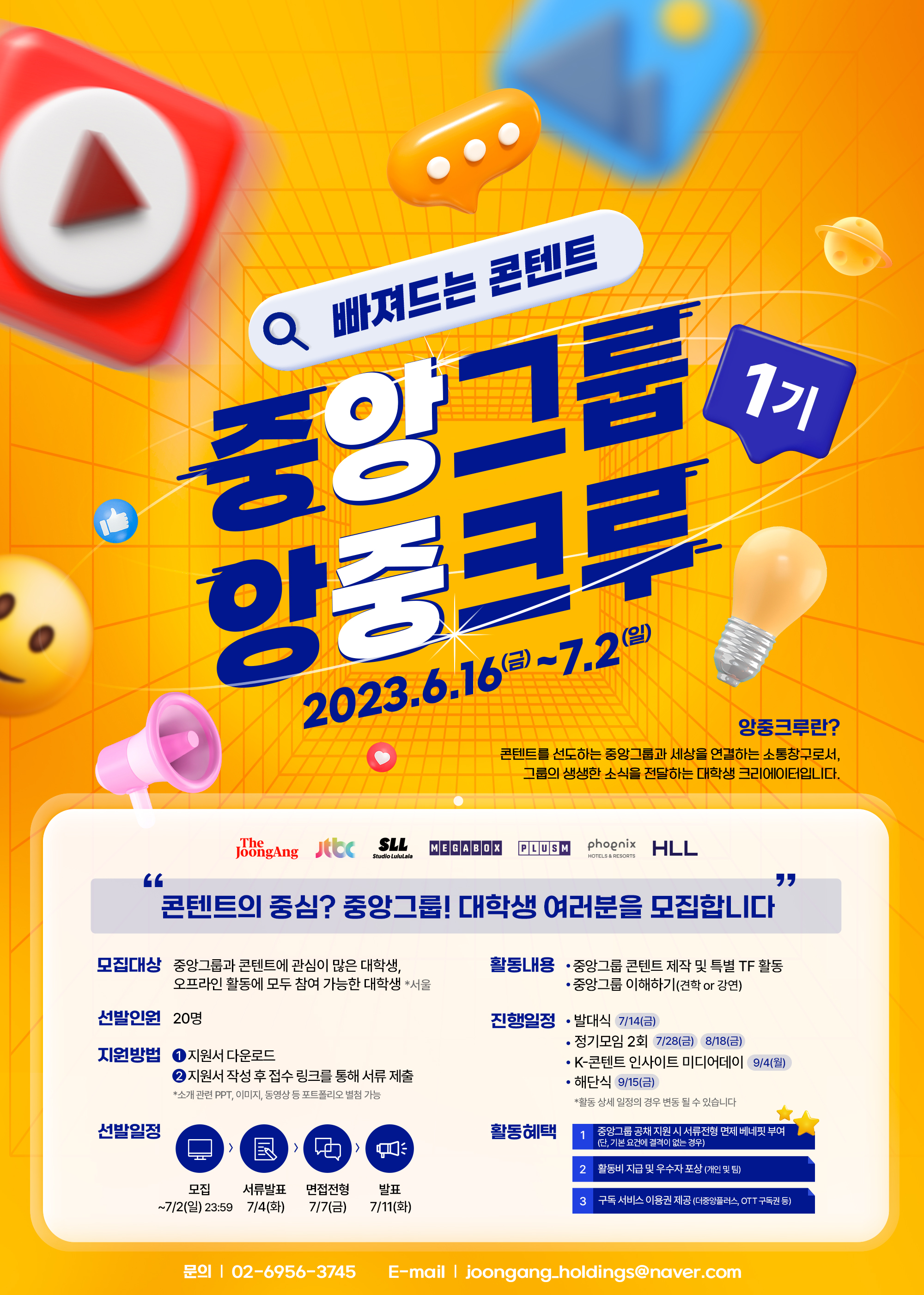 * 모집대상 : 중앙그룹과 콘텐트에 관심이 많은 대학생, 오프라인 정기모임에 참여 가능한 대학생