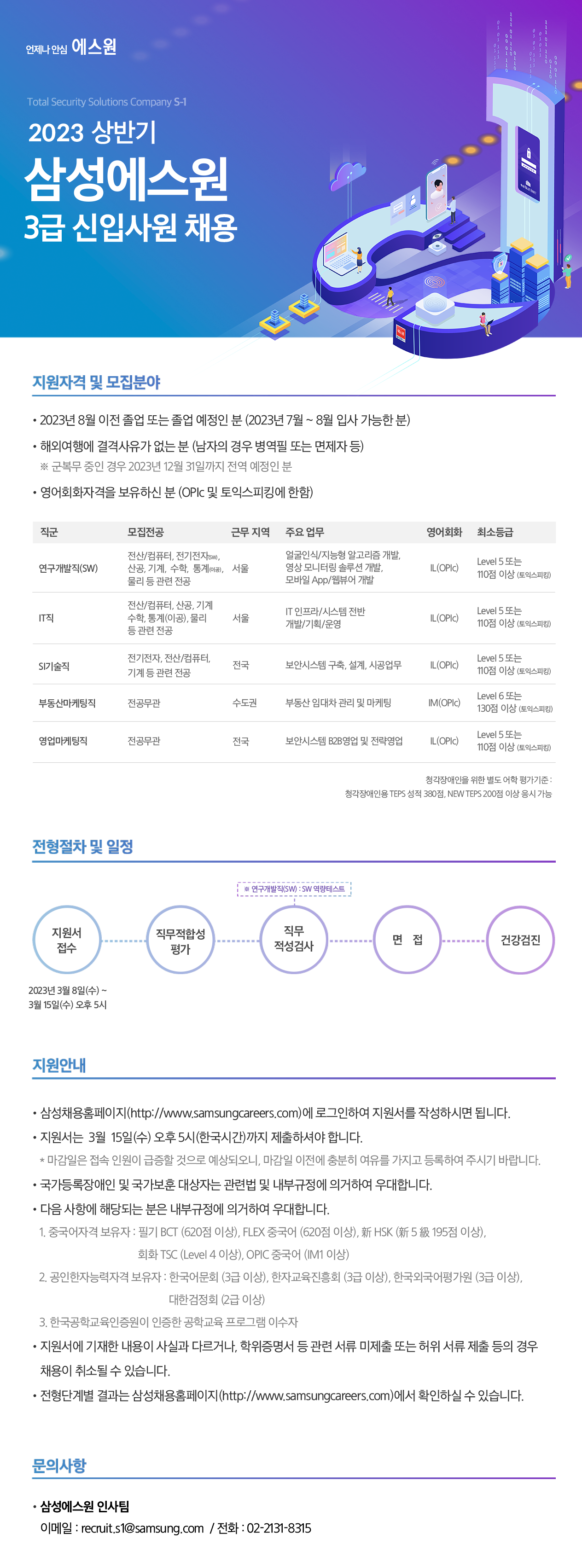 삼성에스원 인사팀 이메일 : recruits1@samsung.com / 전화 : 02-2131-8315