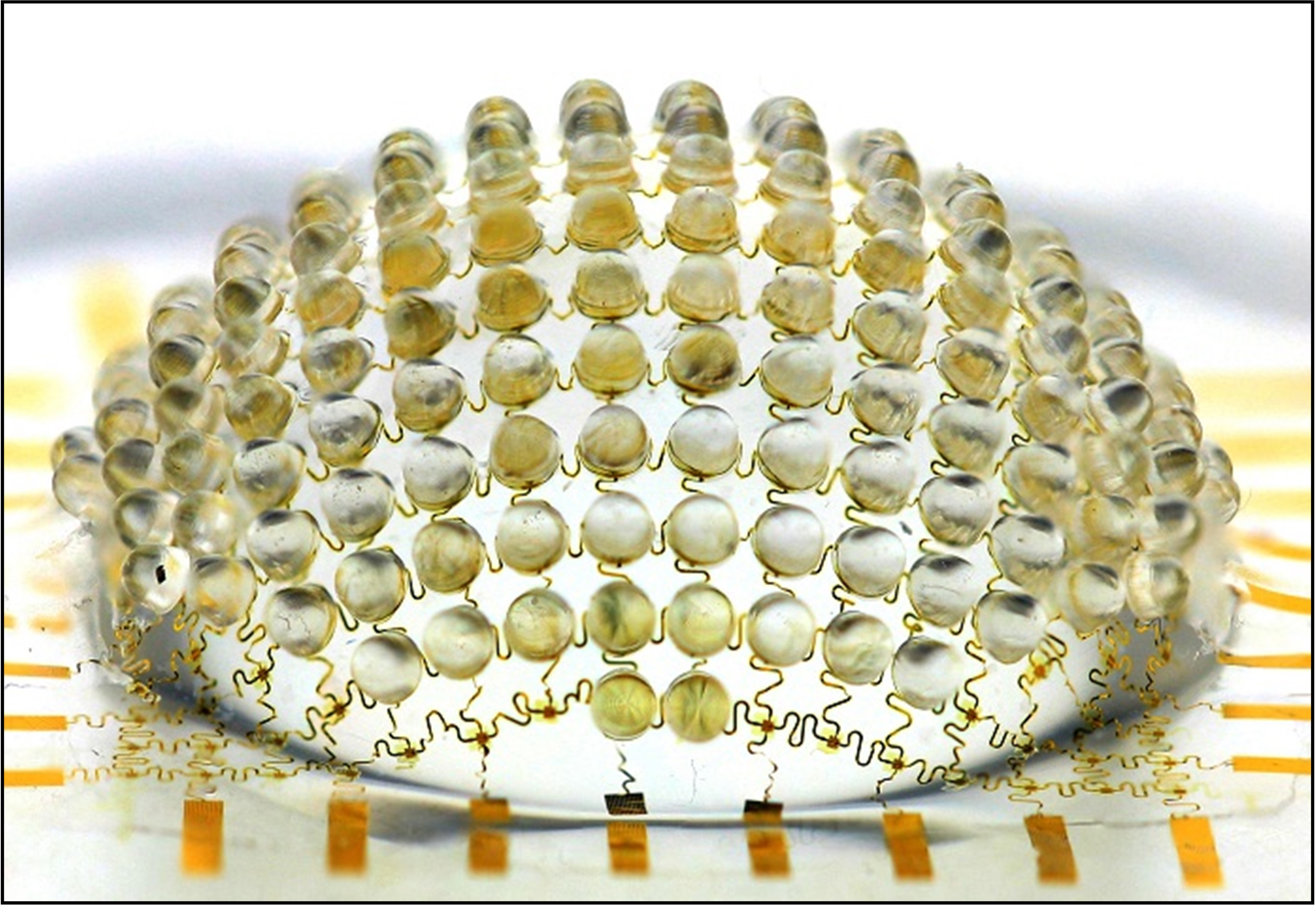 □ (연구 방법) 송영민 박사 연구팀은 곤충 눈 카메라를 개발하기 위해 우선 잡아당기면 늘어나는 형태의 이미지 센서를 만들었다. 이어 이 센서를 고무재질로 된 마이크로렌즈 배열에 부착시킨 후 반구(半球)형 모양으로 변형시켜 곤충의 겹눈 구조와 유사한 카메라를 만들었다.
