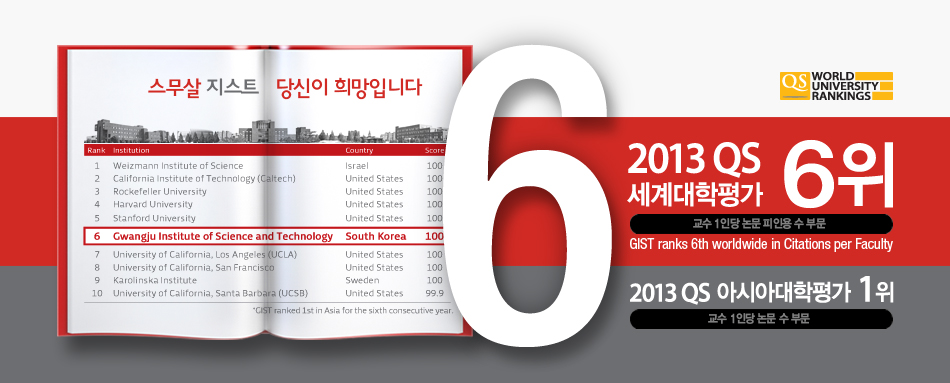 □ 광주과학기술원(GIST‧지스트‧총장 김영준)이 영국 글로벌 대학평가기관인 QS 社가 9월 10일 발표한 2013년 세계대학평가의 ‘교수 1인당 논문 피인용 수(Citations per Faculty)’ 부문에서 지난해보다 한 단계 상승한 세계 6위로 평가됐다. (*QS: Quacquarelli Symonds)