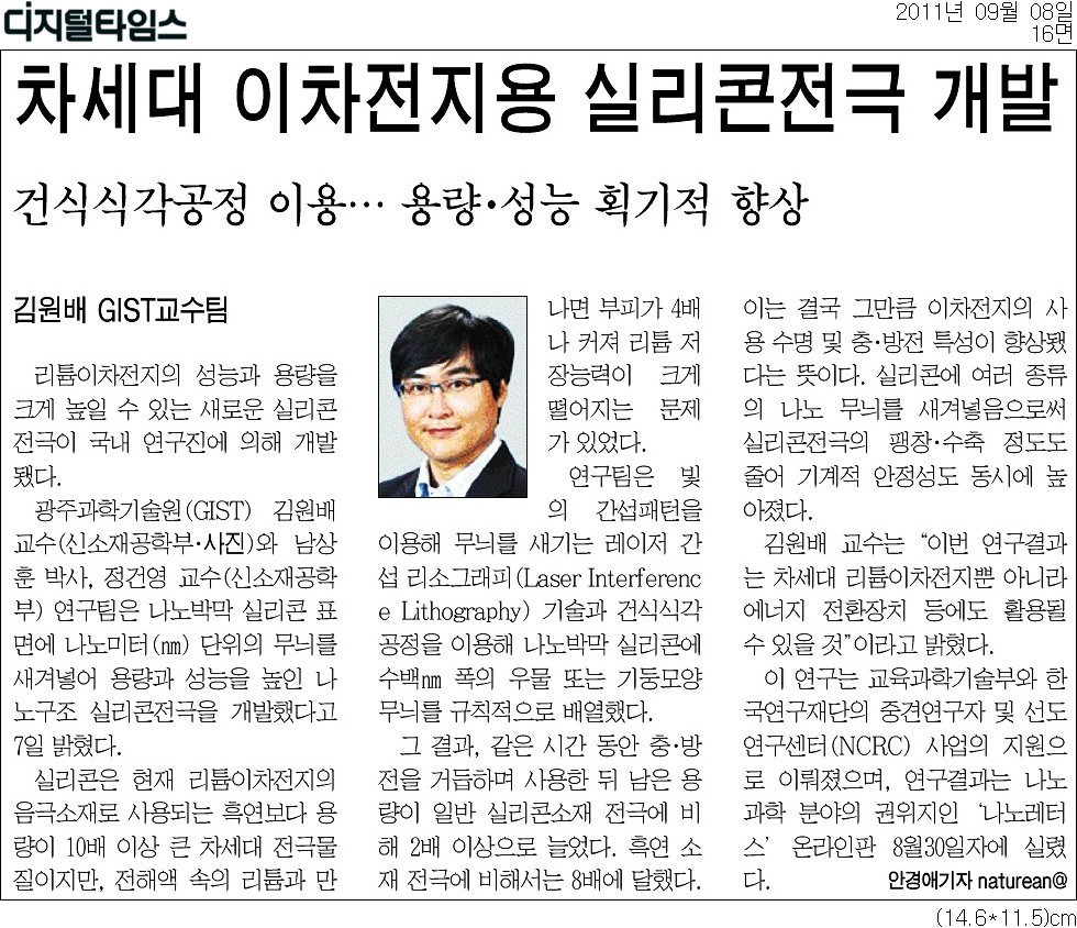김원배 교수(신소재공학부)가 주도한 연구팀이 표면에 나노미터( 10억분의 1) 단위의 무늬를 규칙적으로 새긴 실리콘 전극을 개발했다고 8일 밝혔다