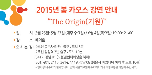 o 2015년 상반기 카오스 강연은 오는 5월 27일까지 매주 수요일 오후 7시부터 2시간 동안 10주에 걸쳐 서울 삼성동 베어홀에서 진행된다. 참석하지 못하는 이들을 위해 네이버와 제휴해 생중계 서비스를 제공하며, 강연을 놓친 이용자는 추후 카오스 재단 홈페이지와 네이버 동영상 서비스 ‘TV캐스트(http://tvcast.naver.com/kaos)’에서 강연 동영상을 시청할 수 있다. <끝>