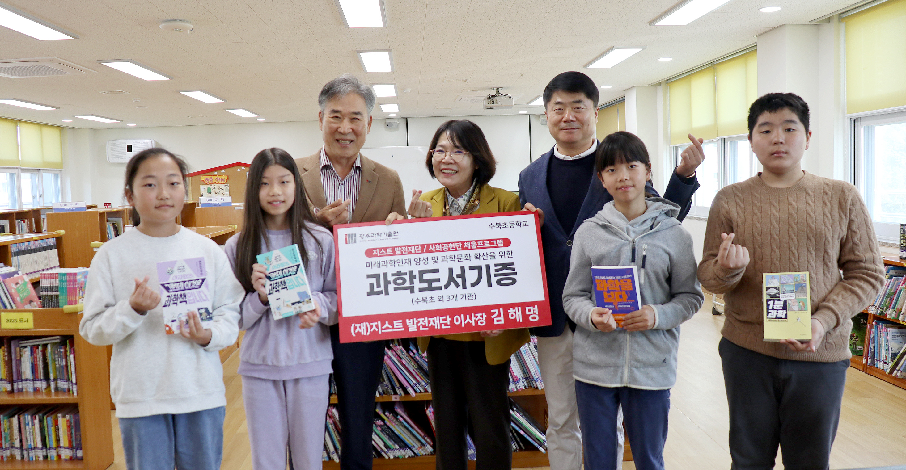 ∘ 도서 전달식은 김해명 (재)지스트발전재단 이사장이 참석한 가운데 7일(목) 수북초등학교와 진원초등학교에서 열렸다.