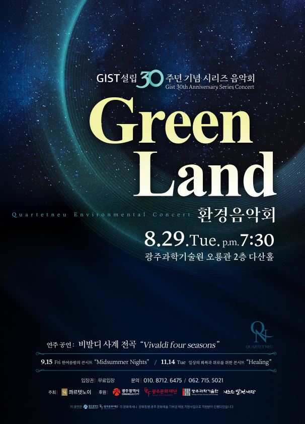 ∘ 총 3회로 구성된 이번 음악회의 첫 번째 공연은 오는 8월 29일(화) 오후 7시 30분, GIST 오룡관 2층 다산홀(535석)에서 ‘환경음악회 – 그린 랜드(Green Land)’를 주제로 열린다.