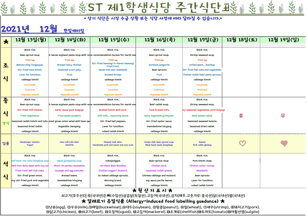 제1학식당 12월 2째주 식단표(12/13~12/17)