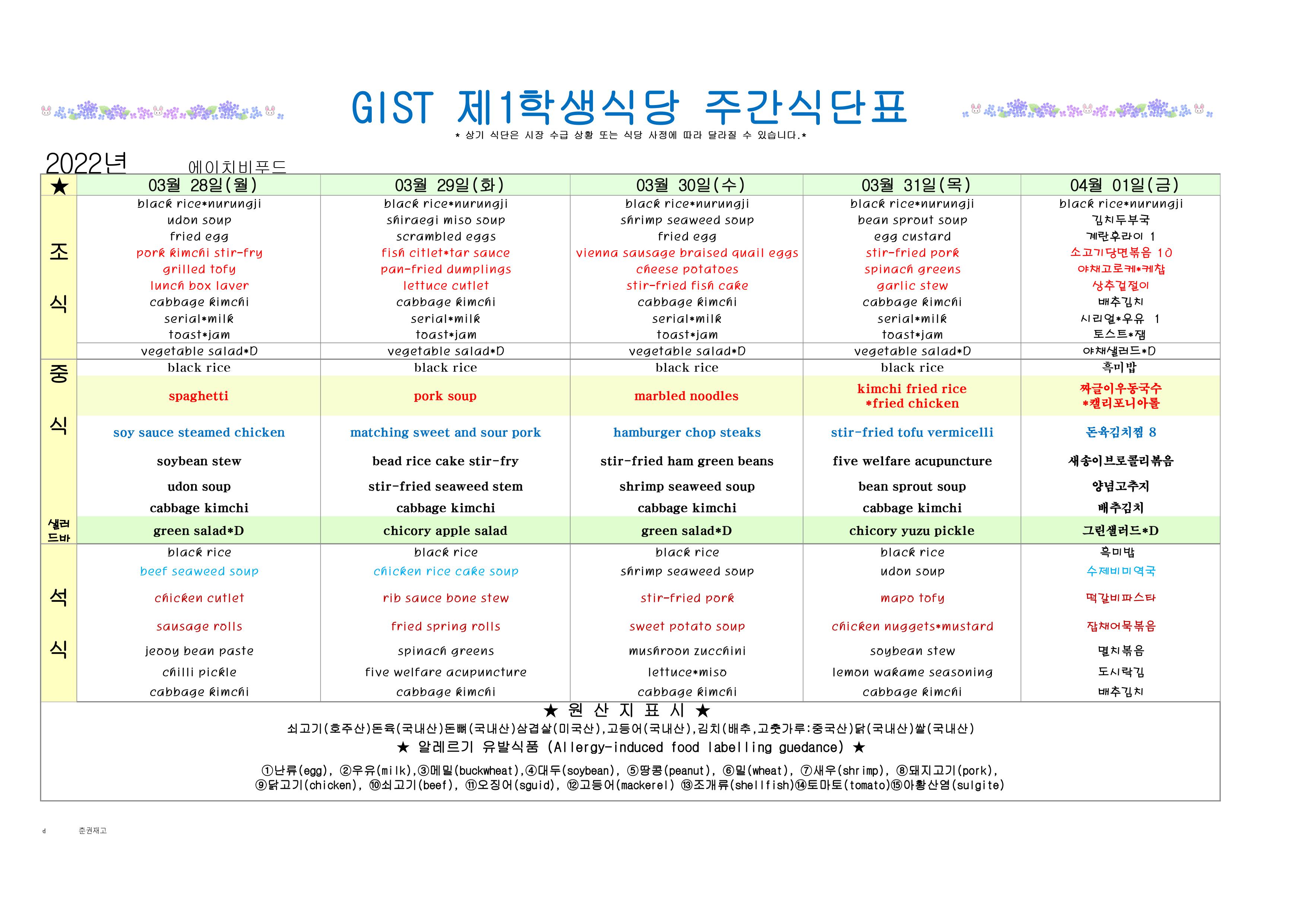 2022년3월5째주메뉴(3월28일~4월1일)