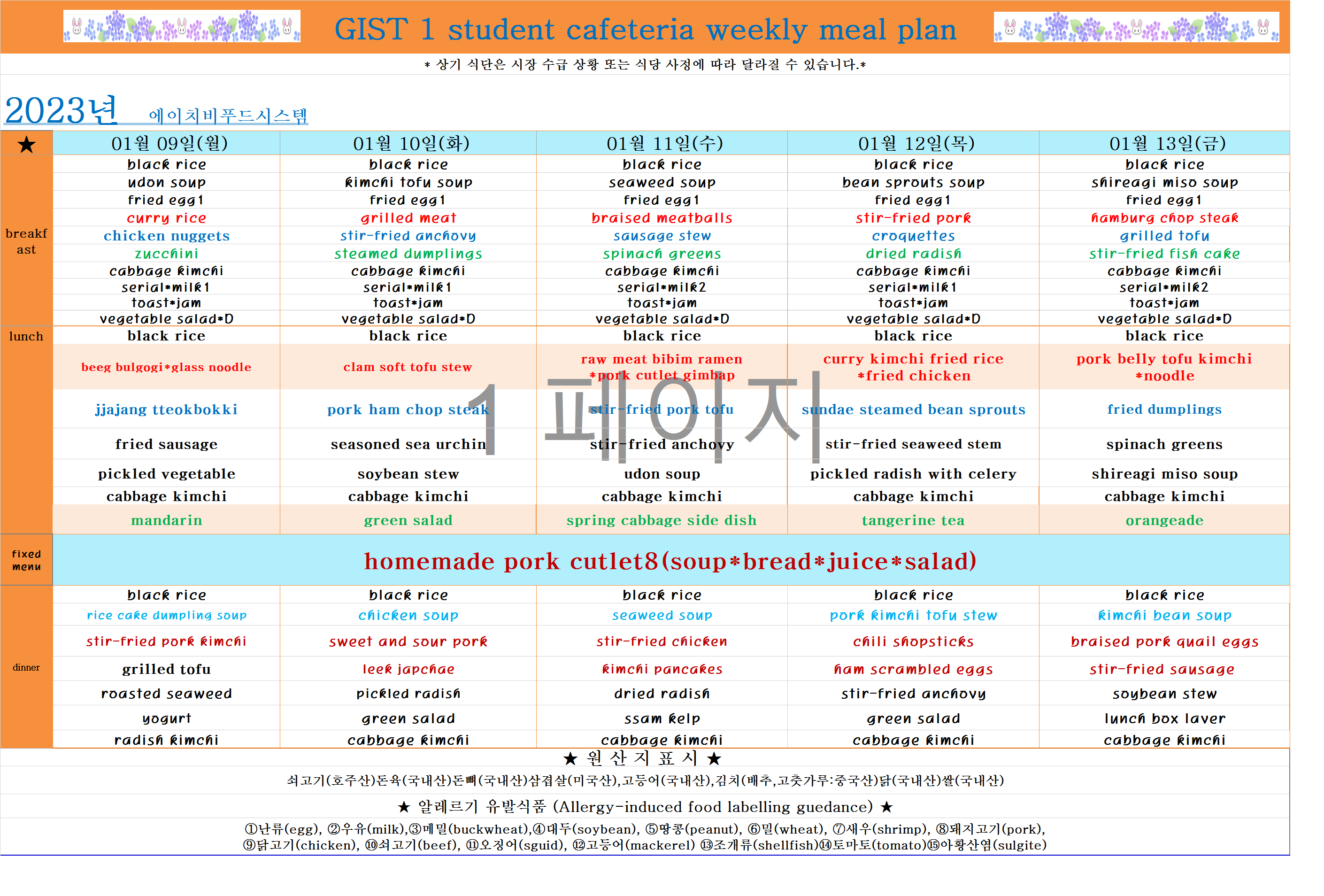 2023년 1월2째주식단표(1월9일~1월13일)